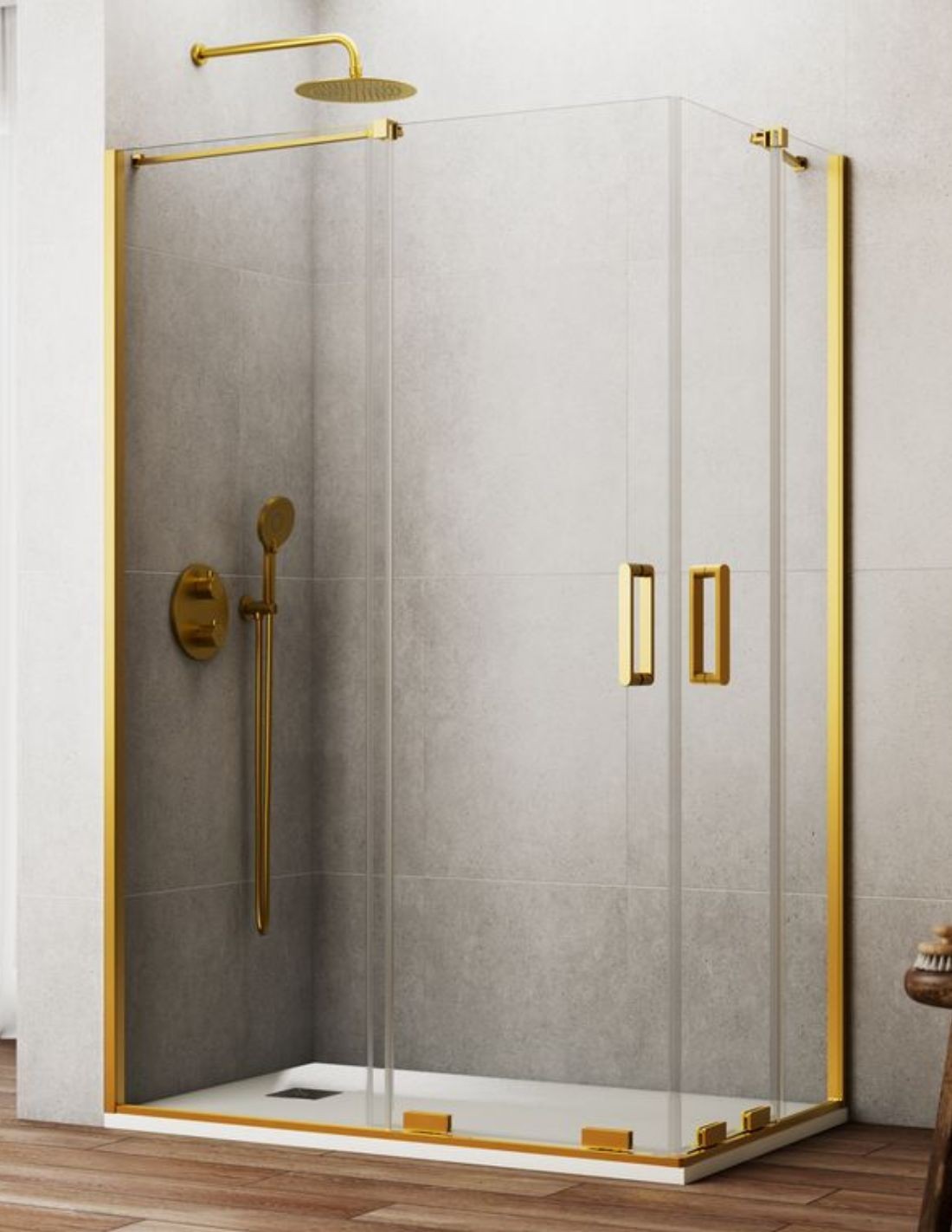 Mampara angular dorada fijos + correderas - 8 mm. KENNA de 1 fijo y 1 puerta corredera con vidrio transparente. Si buscas elevar tu espacio del baño a otro nivel, este modelo de mampara es lo que vas buscando. ¡Descúbrela!