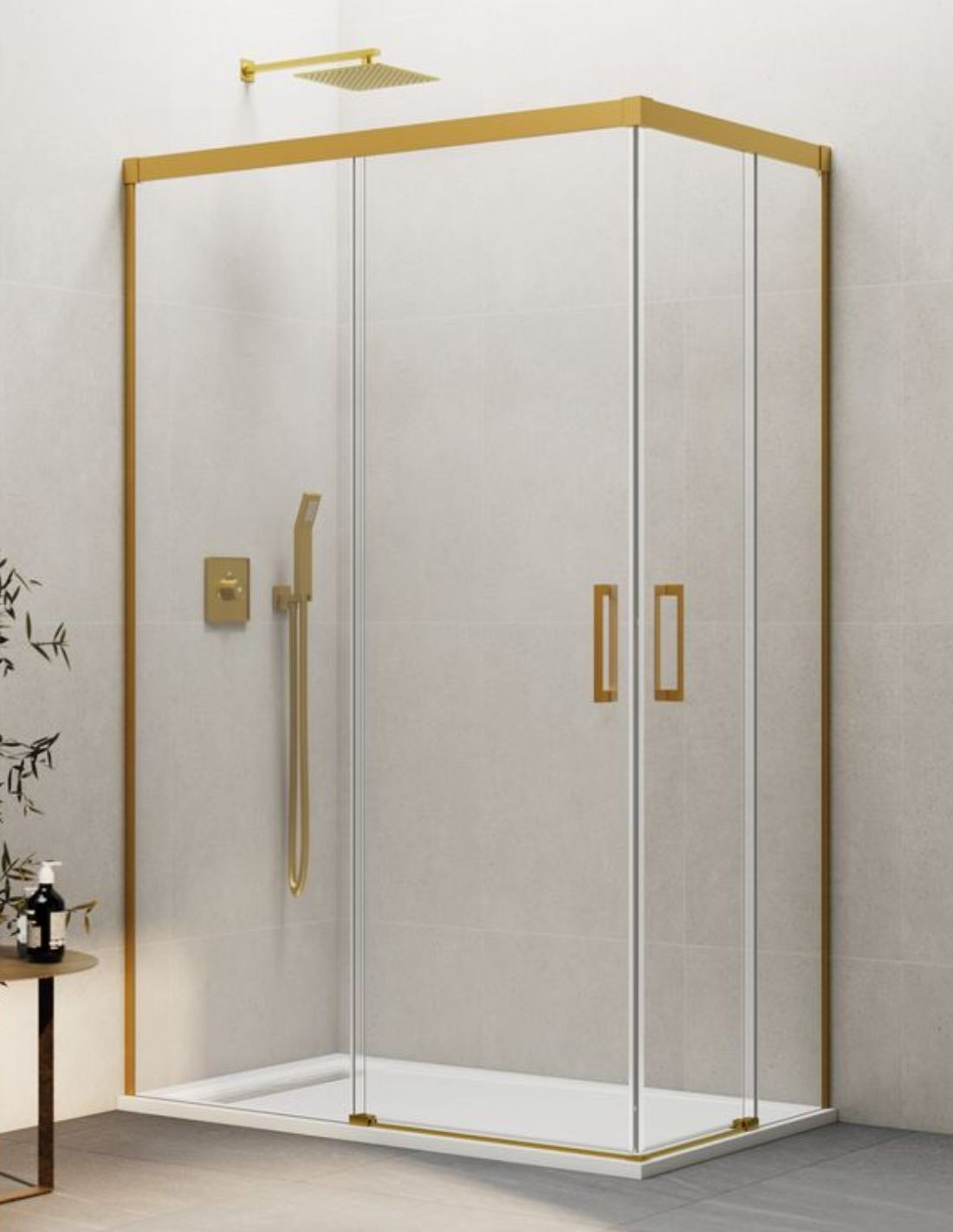 Mampara angular Basic dorada modelo 2 fijos + 2 correderas. Esta mampara es ideal para baños que buscan estar a la última con perfiles minimalistas.
