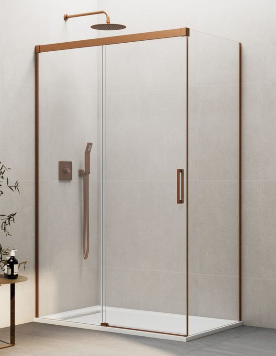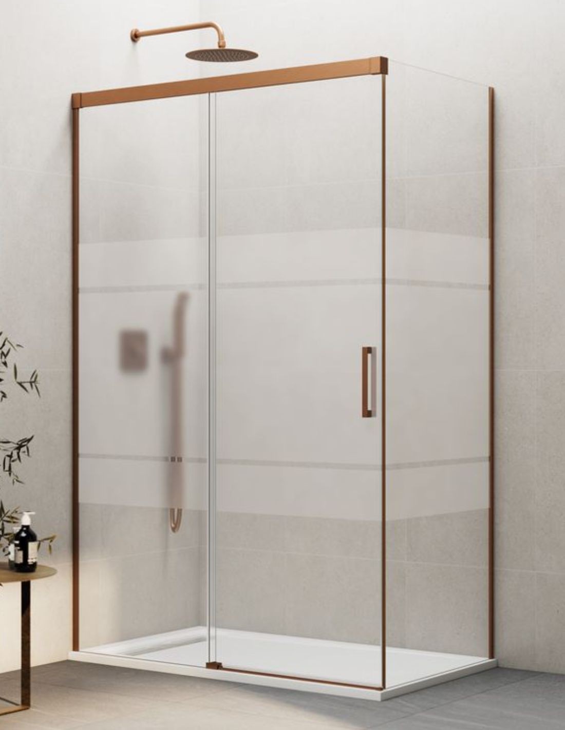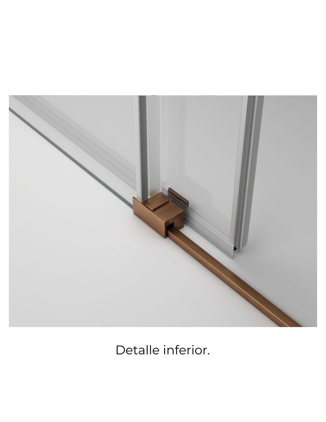 Mampara Basic cobre + lateral fijo modelo 1 fijo y 1 corredera + lateral fijo. Esta mampara es ideal para baños que buscan estar a la última con perfiles minimalistas.