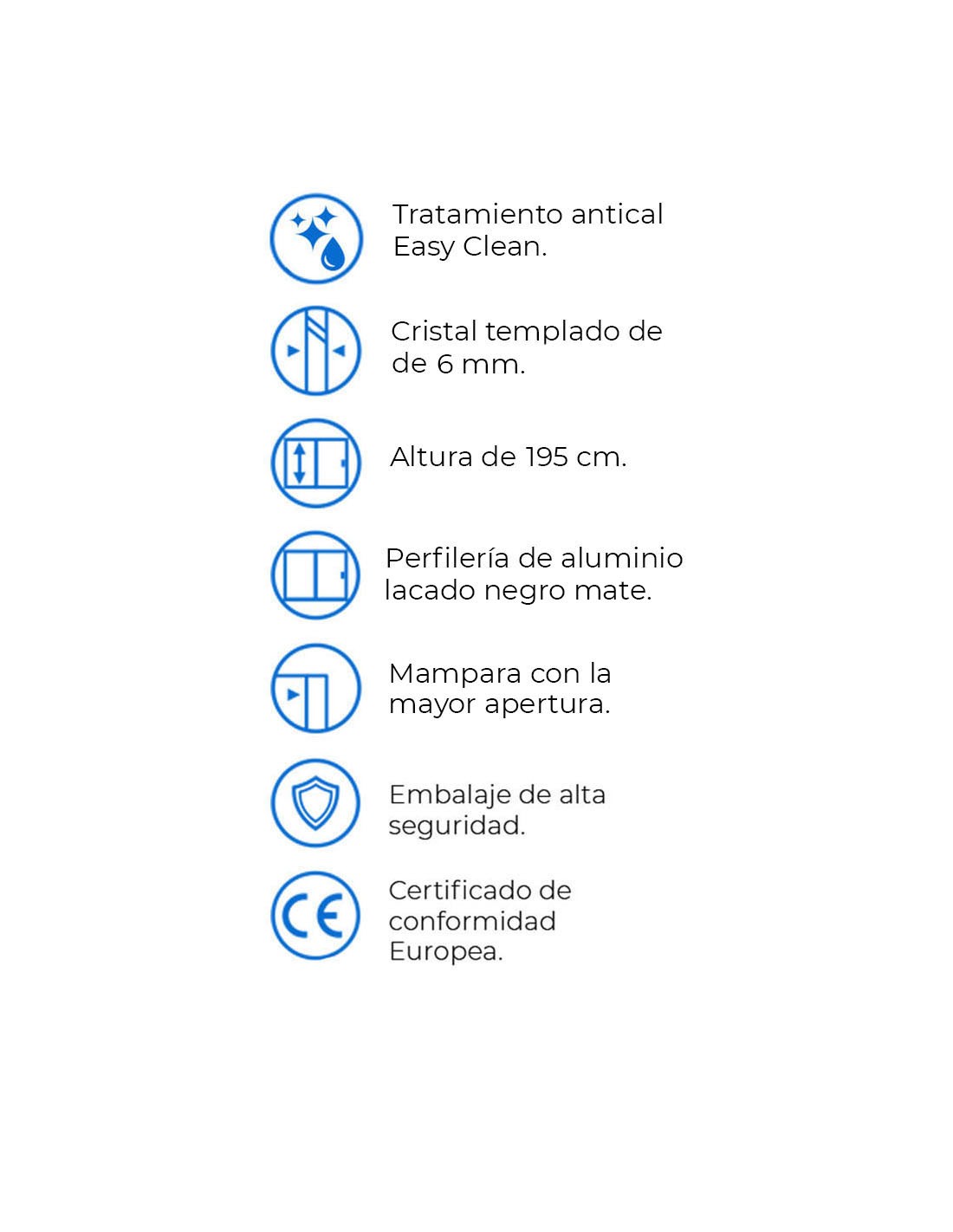 Vidrio templado de seguridad de 6 mm de espesor en frontal. En caso de rotura se parte trozos pequeños que no se desprenden de la estructura de la mampara.