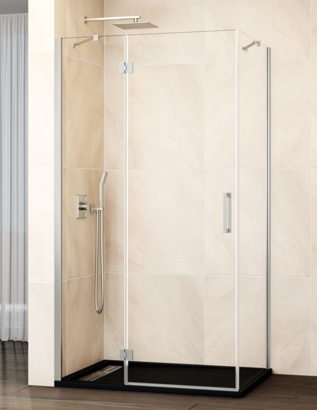 Mampara níquel abatible y fijo frontal + lateral fijo modelo GLASS de 1 hoja fija + 1 puerta abatible de GME.