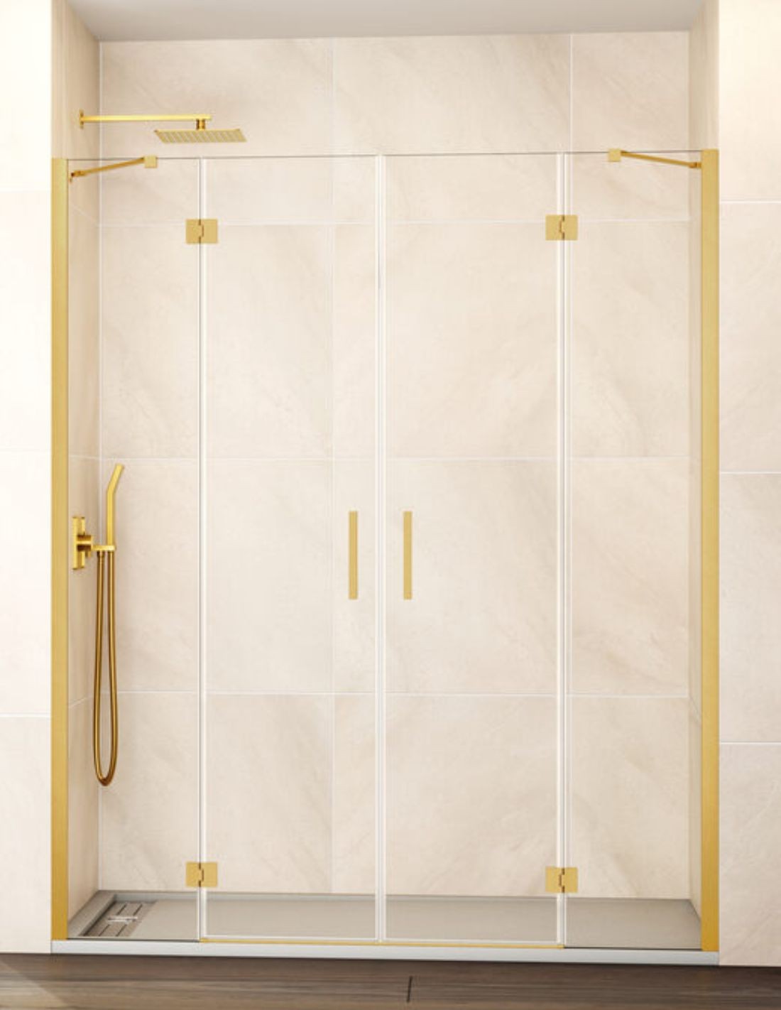 Mampara frontal abatible dorada modelo GLASS de 2 hojas fijas + 2 puertas abatibles de GME.