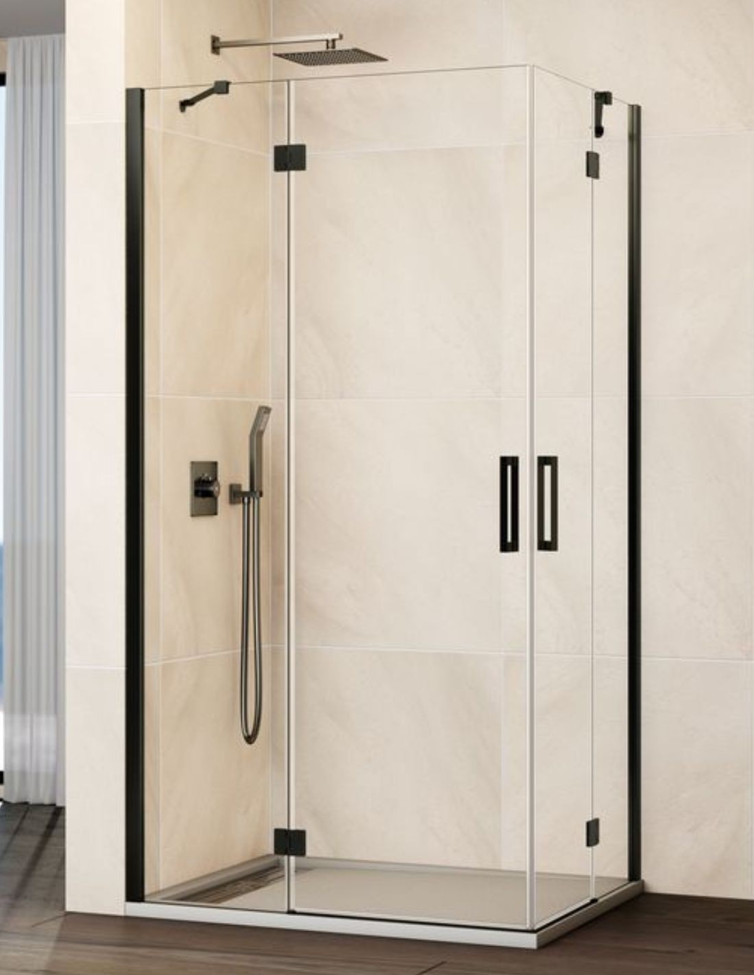 Mampara angular abatible titanio modelo GLASS de 2 hojas fijas + 2 puertas abatibles de GME.