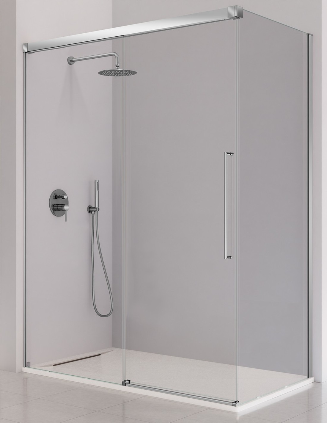 Mampara de ducha cromo - 1 fijo + 1 corredera + 1 lateral fijo PAVIA de Kassandra. Con tratamiento antical y sistema de fácil liberación de puertas para la limpieza.