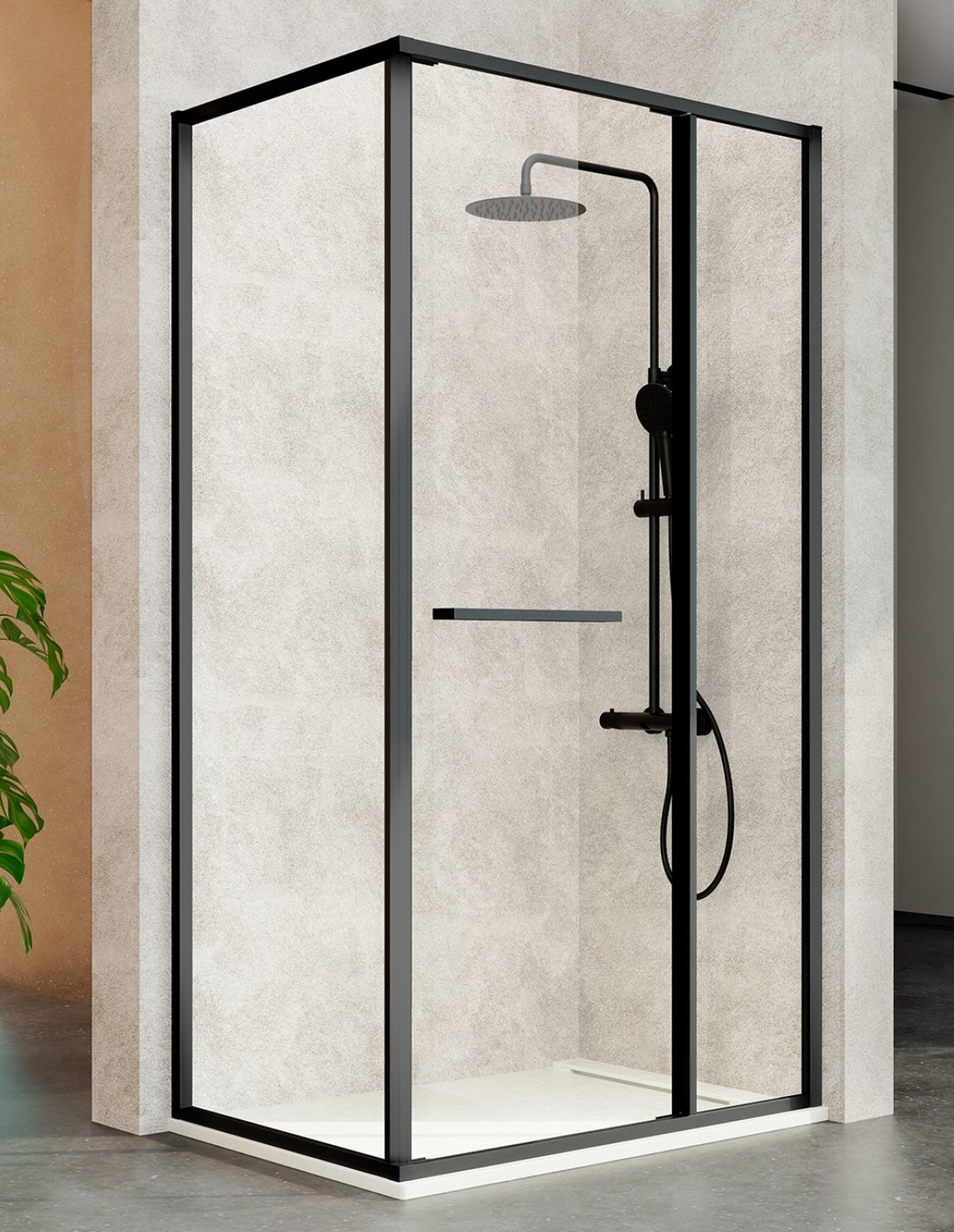 Mampara de ducha frontal negro - 1 puerta orientable + 1 fijo frontal + 1 fijo lateral ÚNICA de Kassandra