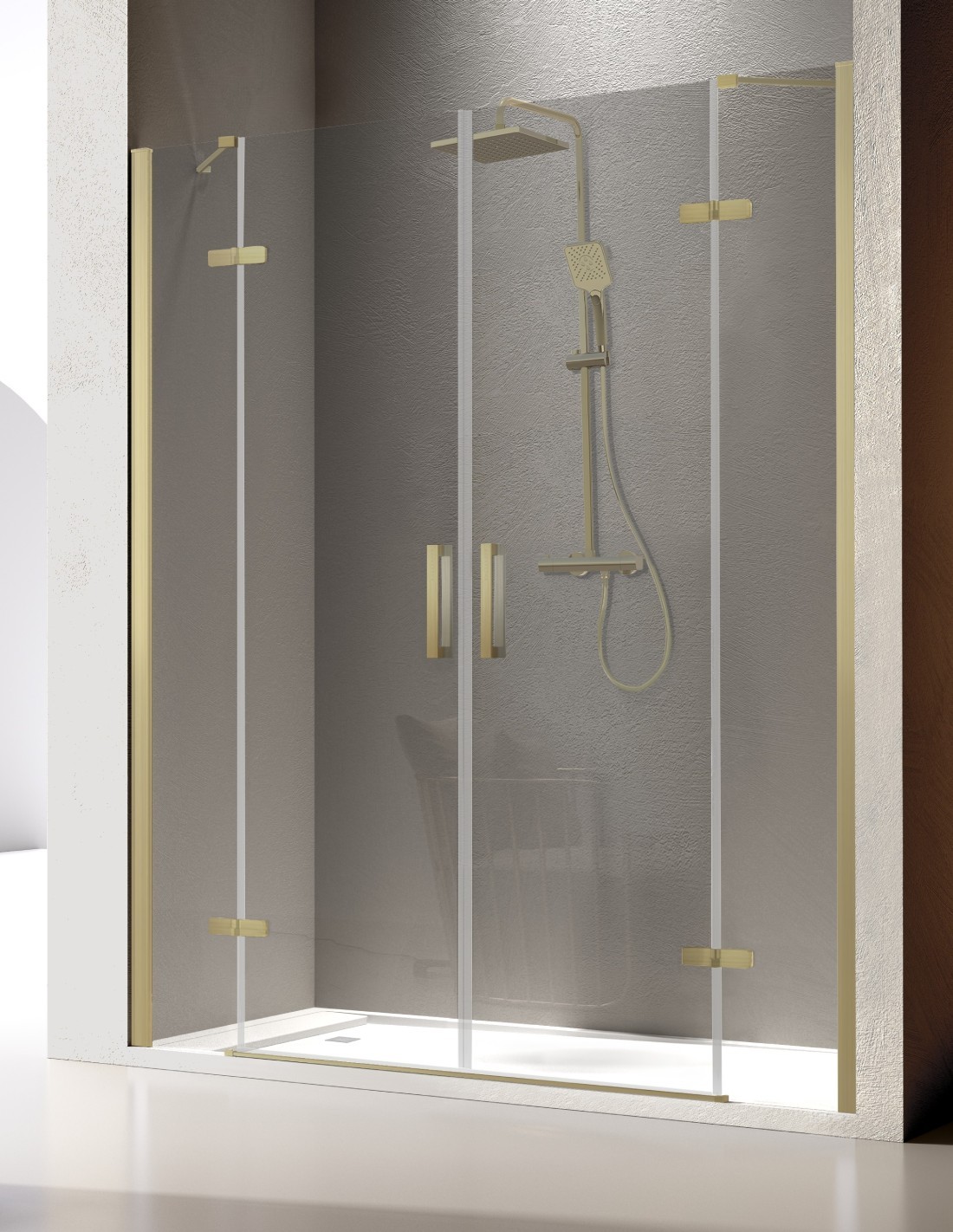 ¿Necesitas el máximo espacio de apertura para tu ducha? Nuestra Mampara frontal - 2 Fijos + 2 Puertas abatibles Nardi oro cepillado de Kassandra es el modelo perfecto. Vidrio de 6 mm transparente con tratamiento antical incluido y perfilería oro cepillado.