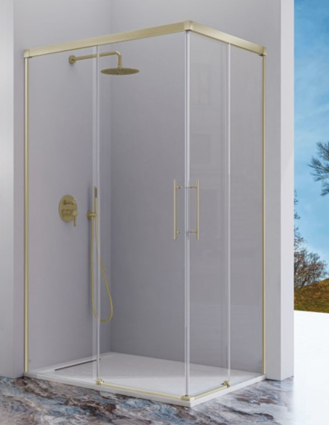 Mampara de ducha angular - oro 2 fijos + 2 puertas correderas URBAN de Kassandra. Vidrio templado de 6 mm.