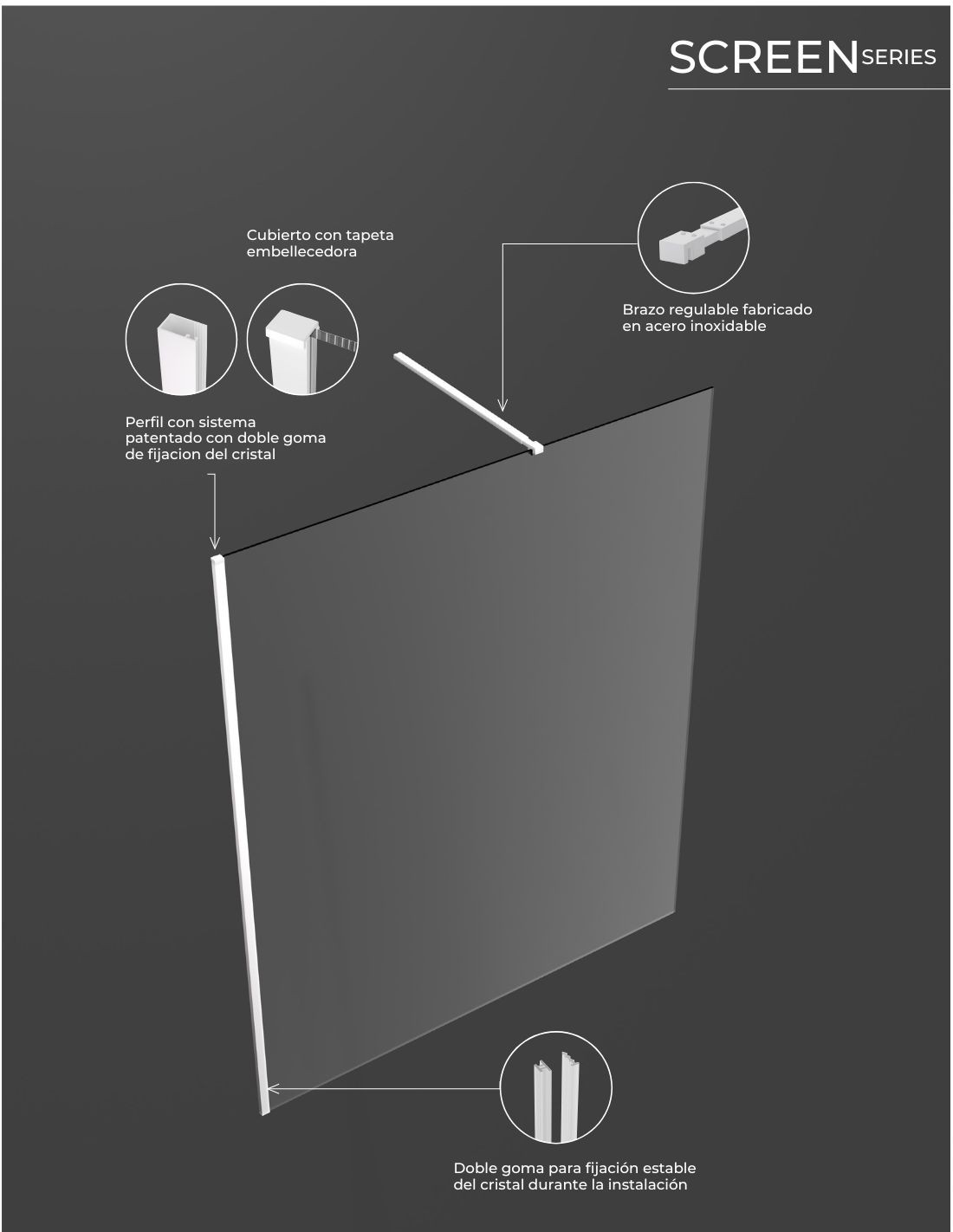 Cristal de vidrio templado. Goma de sellado de PVC. Brazo de sujeción extensible de acero inoxidable SS304 + Zamak. Perfil de pared de aluminio. Tapeta embellecedora blanca de ABS. Goma interior en T de PVC.