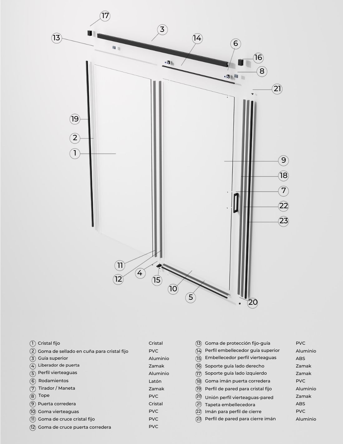 Cristal de vidrio templado. Gomas de sellado de PVC. Guia superior y perfilería de aluminio. Embellecedores de ABS. Todo los elementos metálicos visibles de las mamparas se fabrican en color.