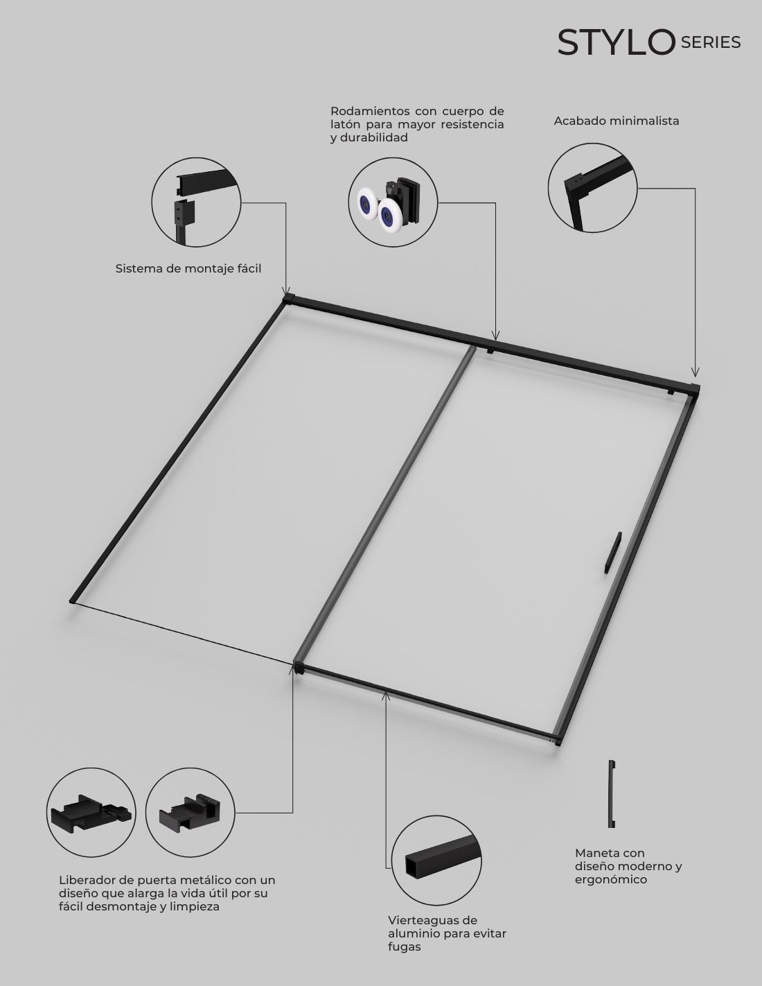 Características principales de la mampara fija y corredera negra Stylo SBX: