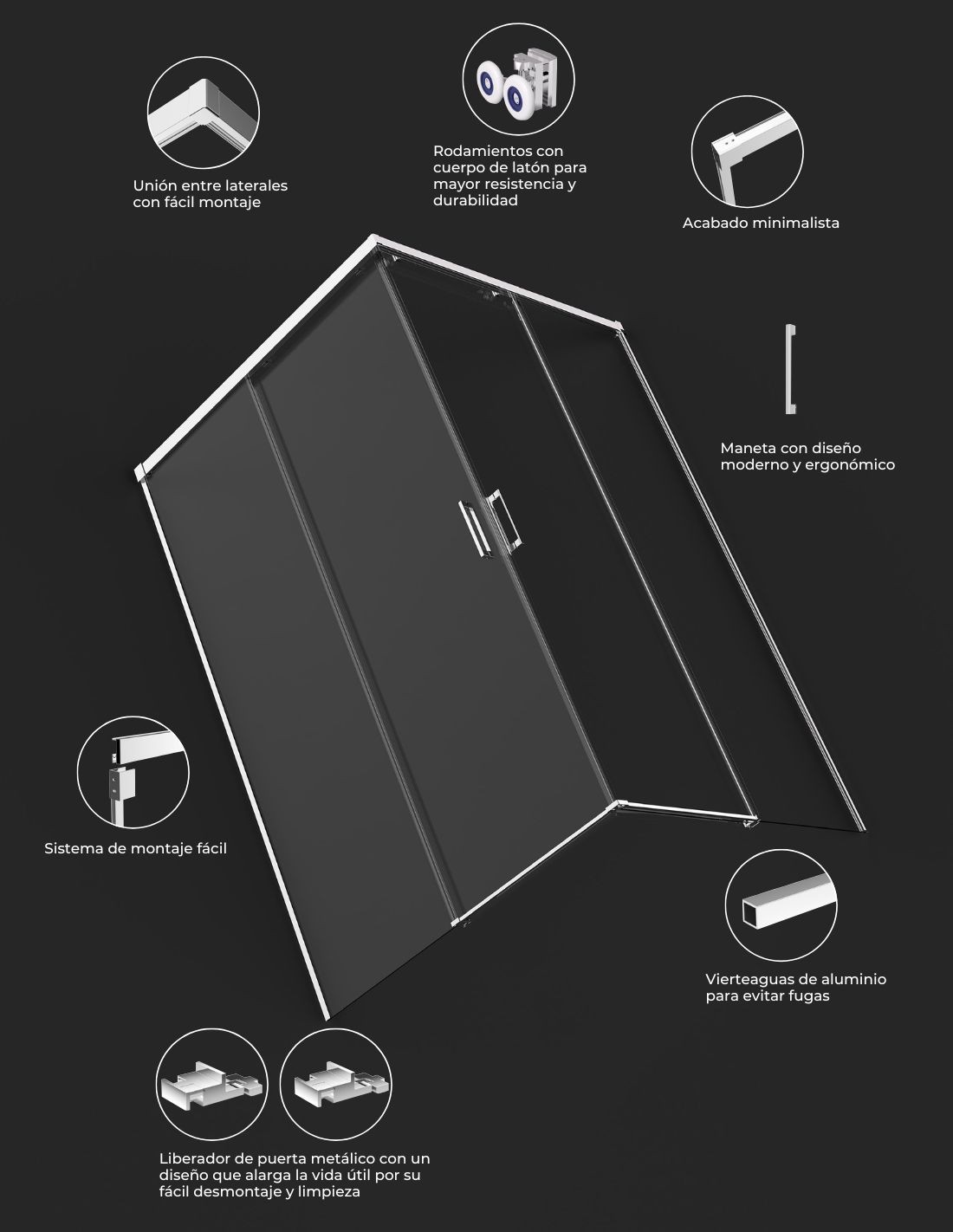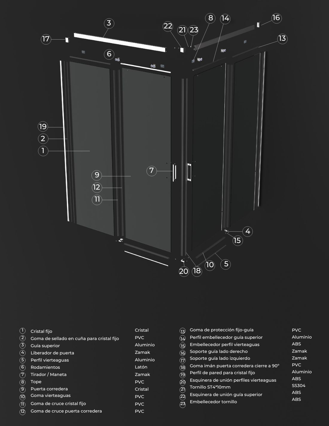 Cristal de vidrio templado. Gomas de sellado de PVC. Guia superior y perfilería de aluminio. Embellecedores de ABS. Todo los elementos metálicos visibles de las mamparas se fabrican en color.