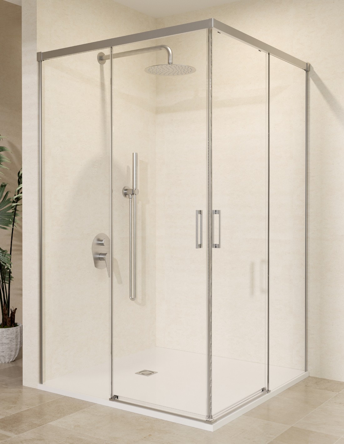 - Mampara de ducha angular 2 hojas fijas y 2 puertas correderas.