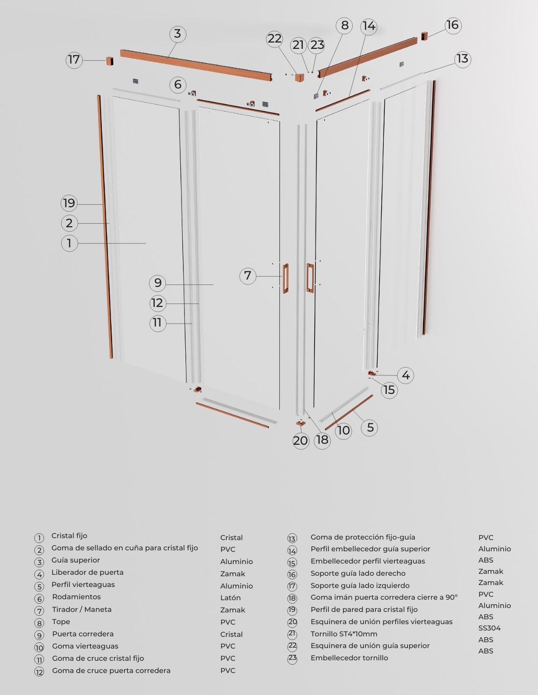 Cristal de vidrio templado. Gomas de sellado de PVC. Guia superior y perfilería de aluminio. Embellecedores de ABS. Todo los elementos metálicos visibles de las mamparas se fabrican en color.