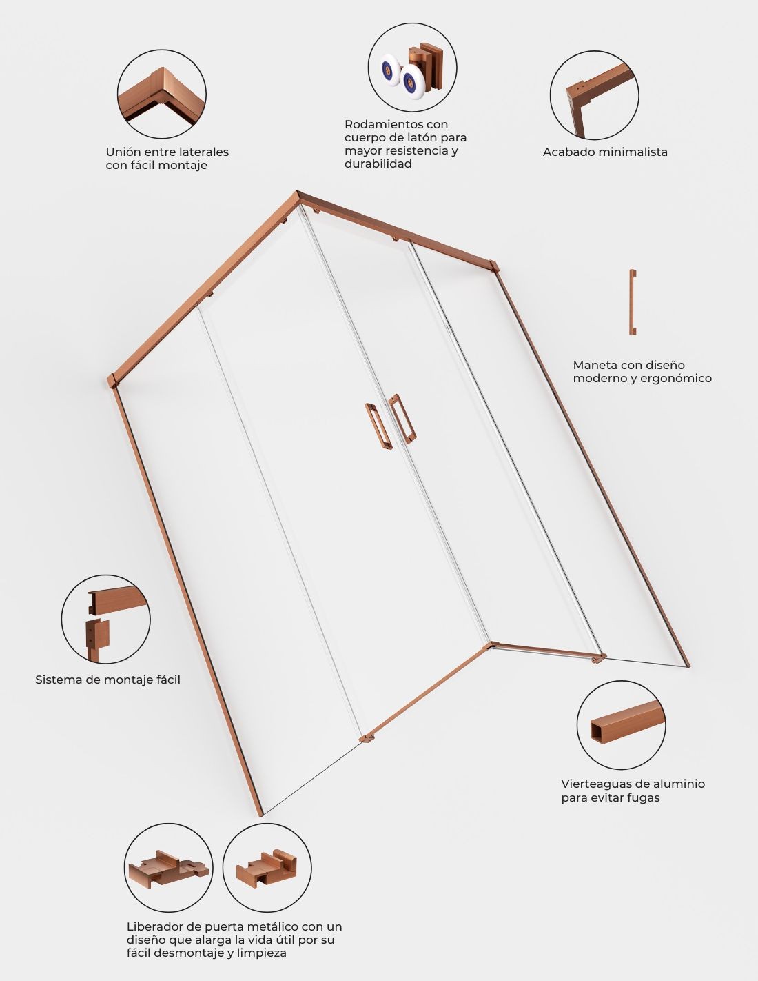 Características principales de la mampara angular dos fijas y dos correderas oro rosa cepillado Stylo SBX: