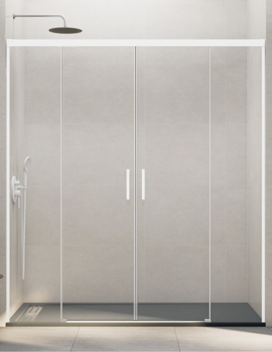 Mampara Basic GME blanca modelo 2 fijos y 2 correderas. Esta mampara es ideal para baños que buscan estar a la última con perfiles minimalistas.
