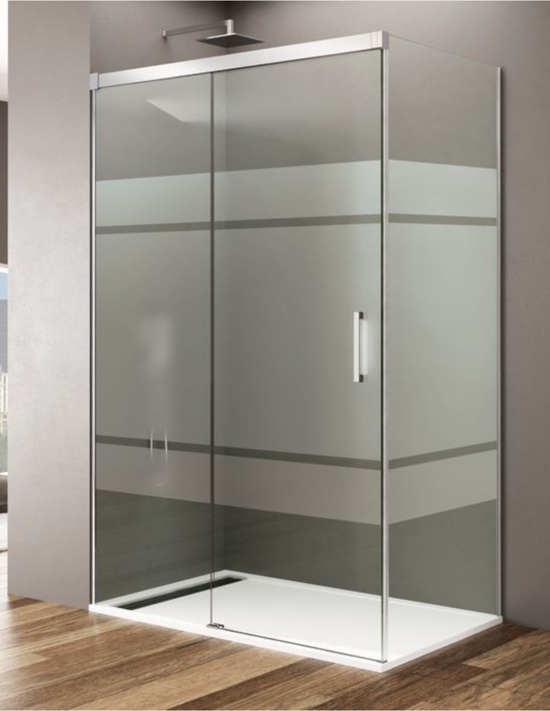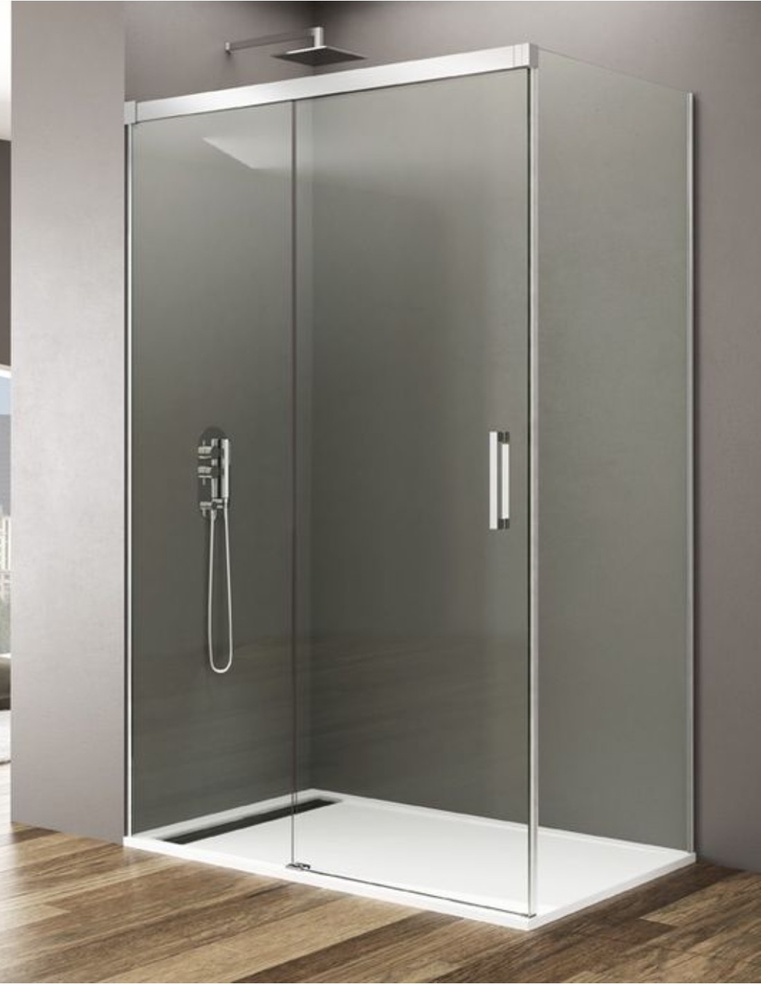 Mampara Basic cromo + lateral fijo modelo 1 fijo y 1 corredera + lateral fijo. Esta mampara es ideal para baños que buscan estar a la última con perfiles minimalistas.