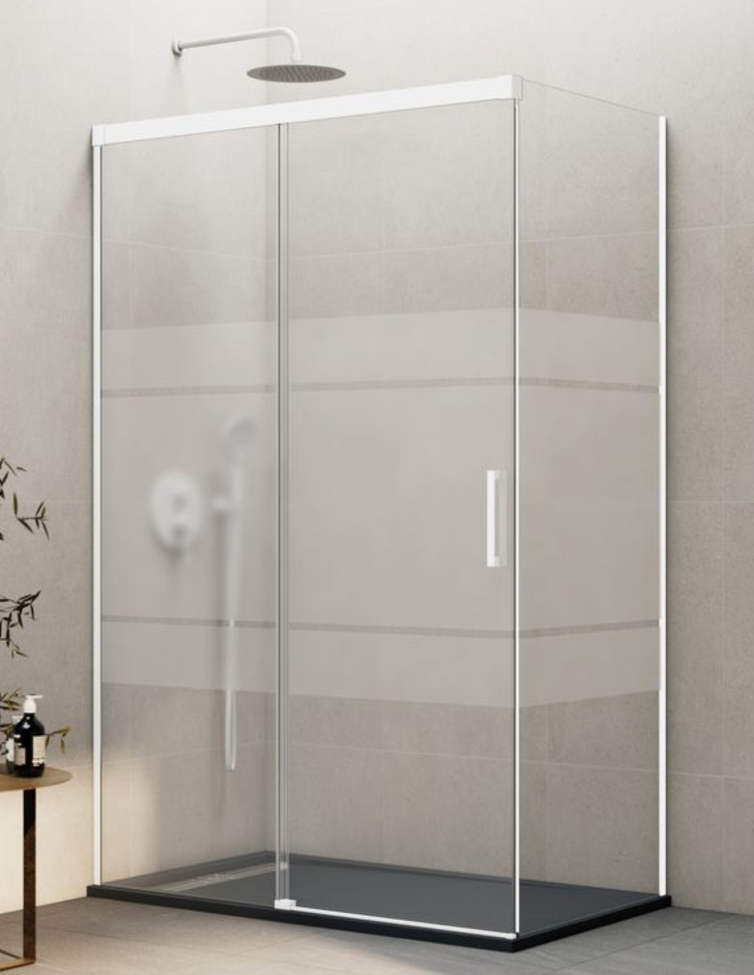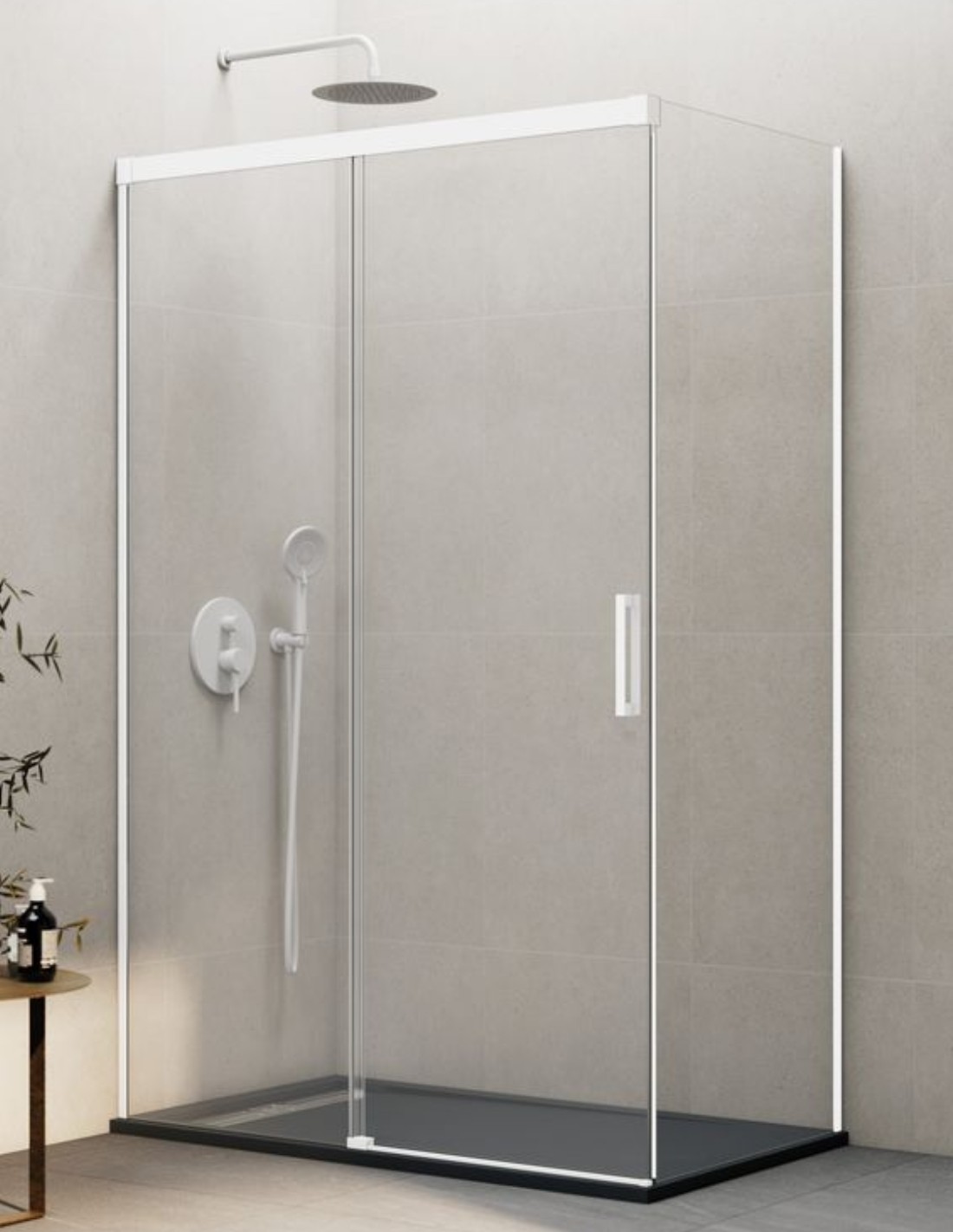 Mampara Basic blanca + lateral fijo modelo 1 fijo y 1 corredera + lateral fijo. Esta mampara es ideal para baños que buscan estar a la última con perfiles minimalistas.