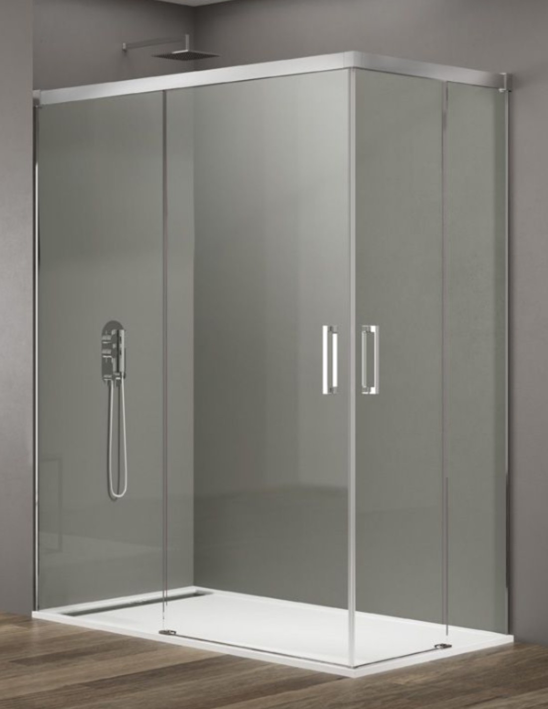 Mampara angular Basic cromo modelo 2 fijos + 2 correderas. Esta mampara es ideal para baños que buscan estar a la última con perfiles minimalistas.