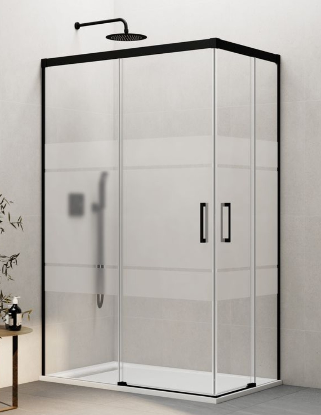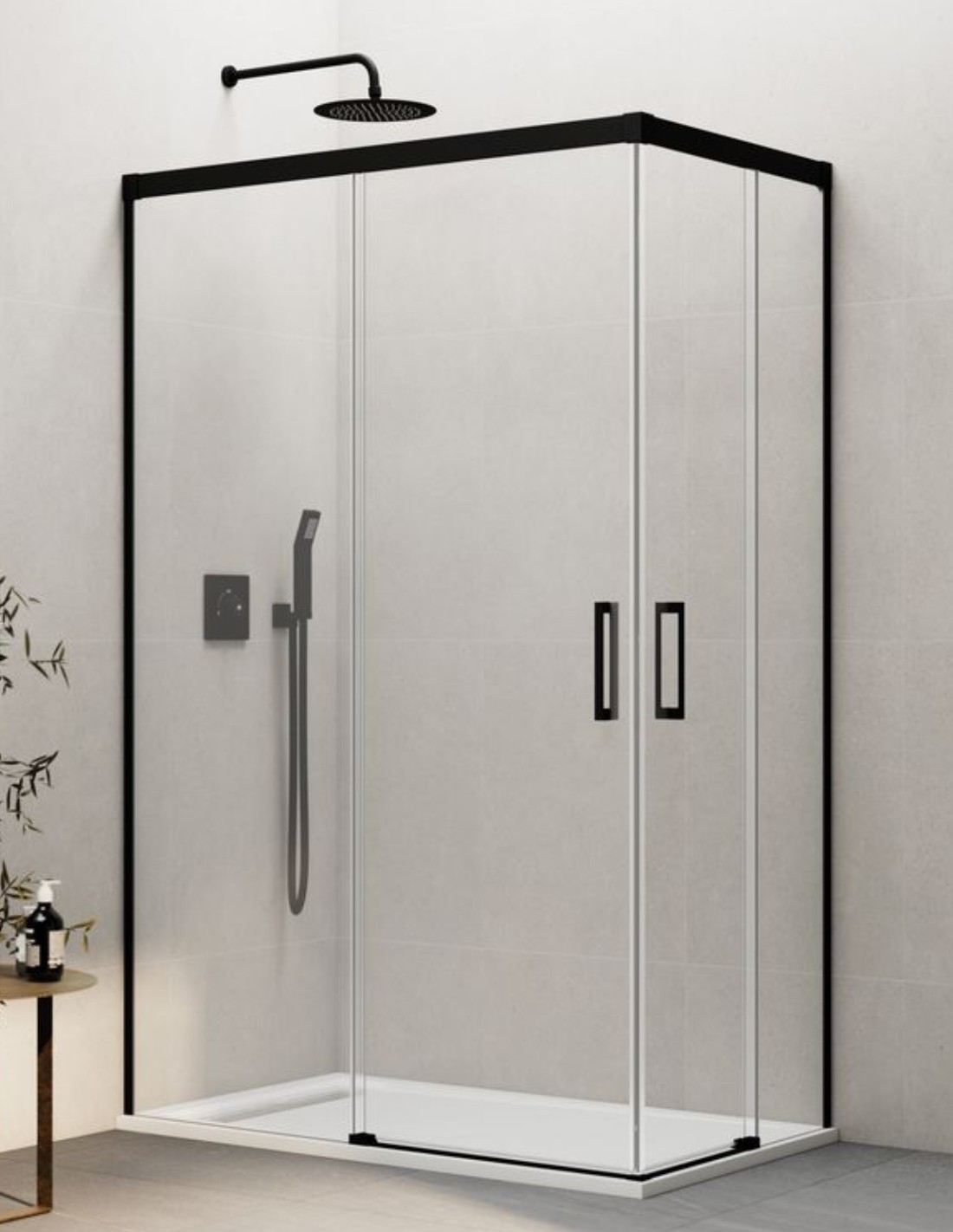 Mampara angular Basic negra modelo 2 fijos + 2 correderas. Esta mampara es ideal para baños que buscan estar a la última con perfiles minimalistas.