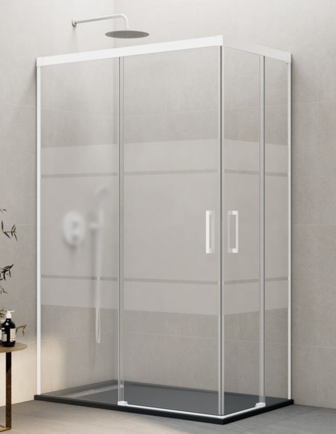Mampara angular Basic blanca modelo 2 fijos + 2 correderas. Esta mampara es ideal para baños que buscan estar a la última con perfiles minimalistas.