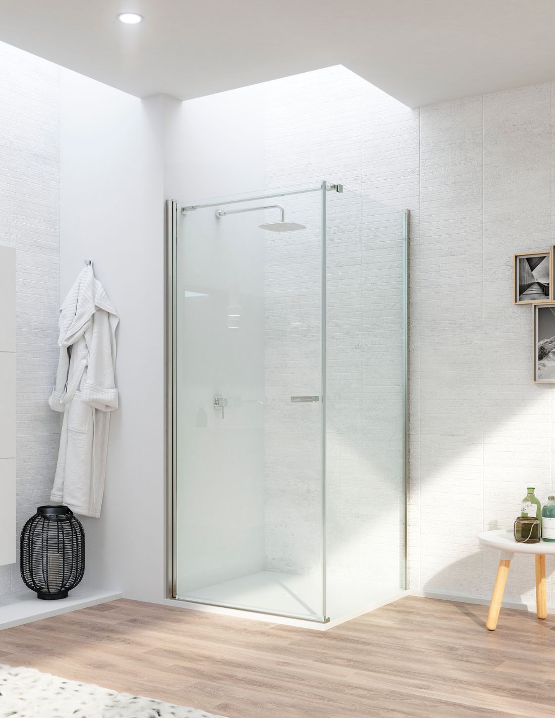 Mampara angular 1 hoja abatible + 1 fijo - plata alta brillo SONY de Bathplus. El acabado Plata alto brillo se aplica mediante un lacado de alta resistencia, proporcionando una textura suave al tacto y una estética contemporánea que combina a la perfección con griferías y accesorios del mismo tono.