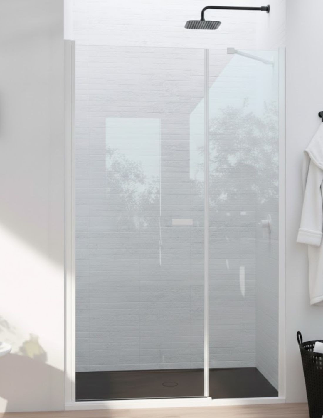 Mampara blanco mate 1 hoja abatible a perfil + 1 hoja fija - SONY de Bathplus. El acabado Blanco mate se aplica mediante un lacado de alta resistencia, proporcionando una textura suave al tacto y una estética contemporánea que combina a la perfección con griferías y accesorios del mismo tono.