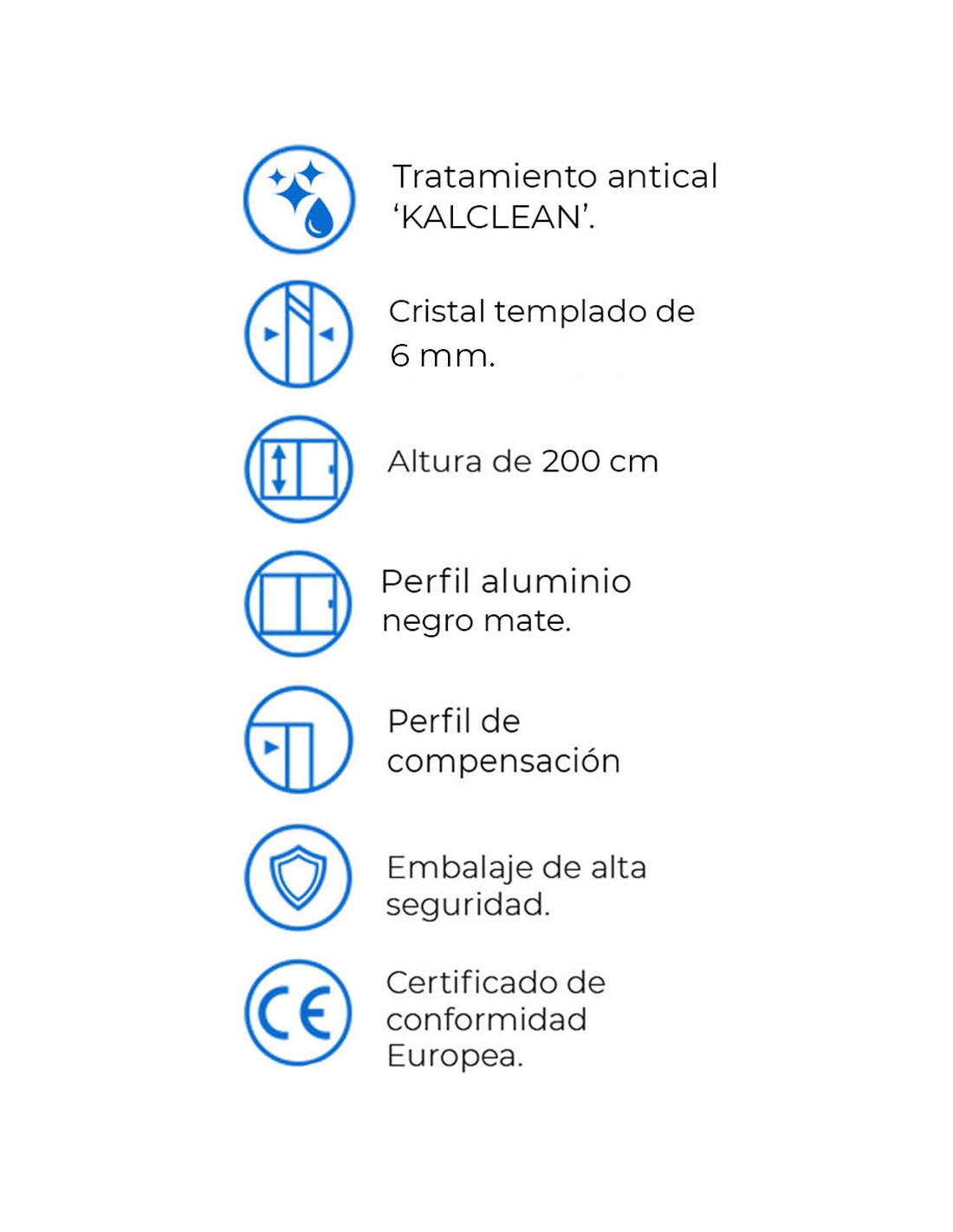 Vidrio templado de seguridad de 6 mm de espesor. En caso de rotura se parte trozos pequeños que no se desprenden de la estructura de la mampara.