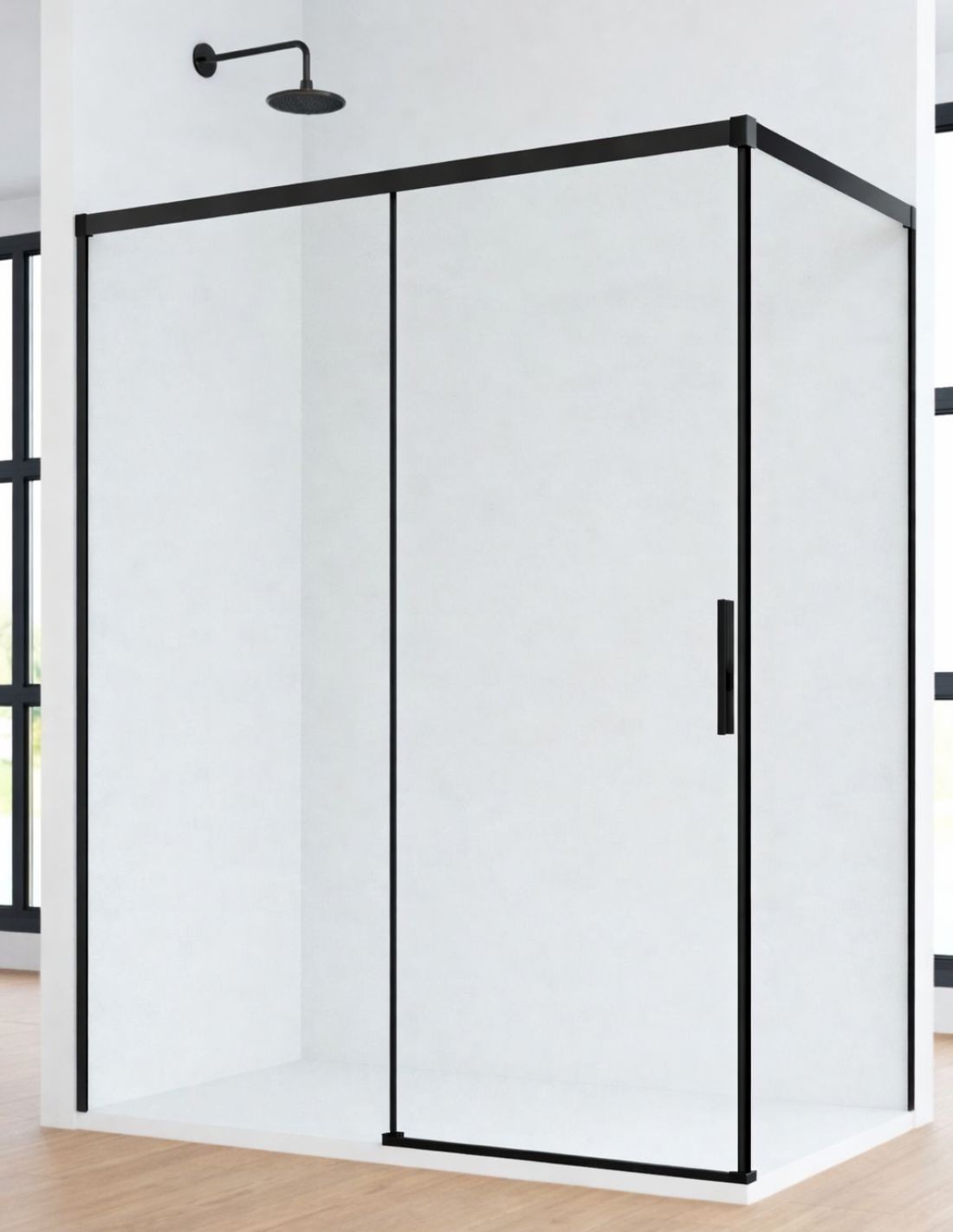 Mampara de ducha negro 1 hoja fija y 1 puerta corredera + lateral fijo CAUCE de Bathplus con perfilería minimalista para darle un toque elegante y de amplitud visual a tu ducha.