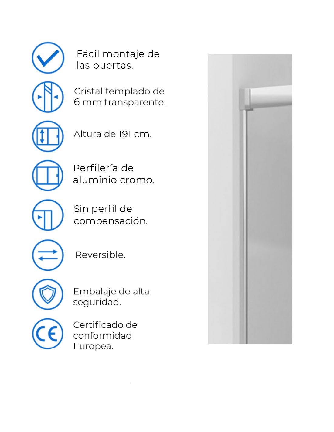•     Reversible en el cristal Incoloro: Posibilidad de invertir la apertura de la puerta cuando se realiza la instalación, consiguiendo elegir la apertura que deseemos.