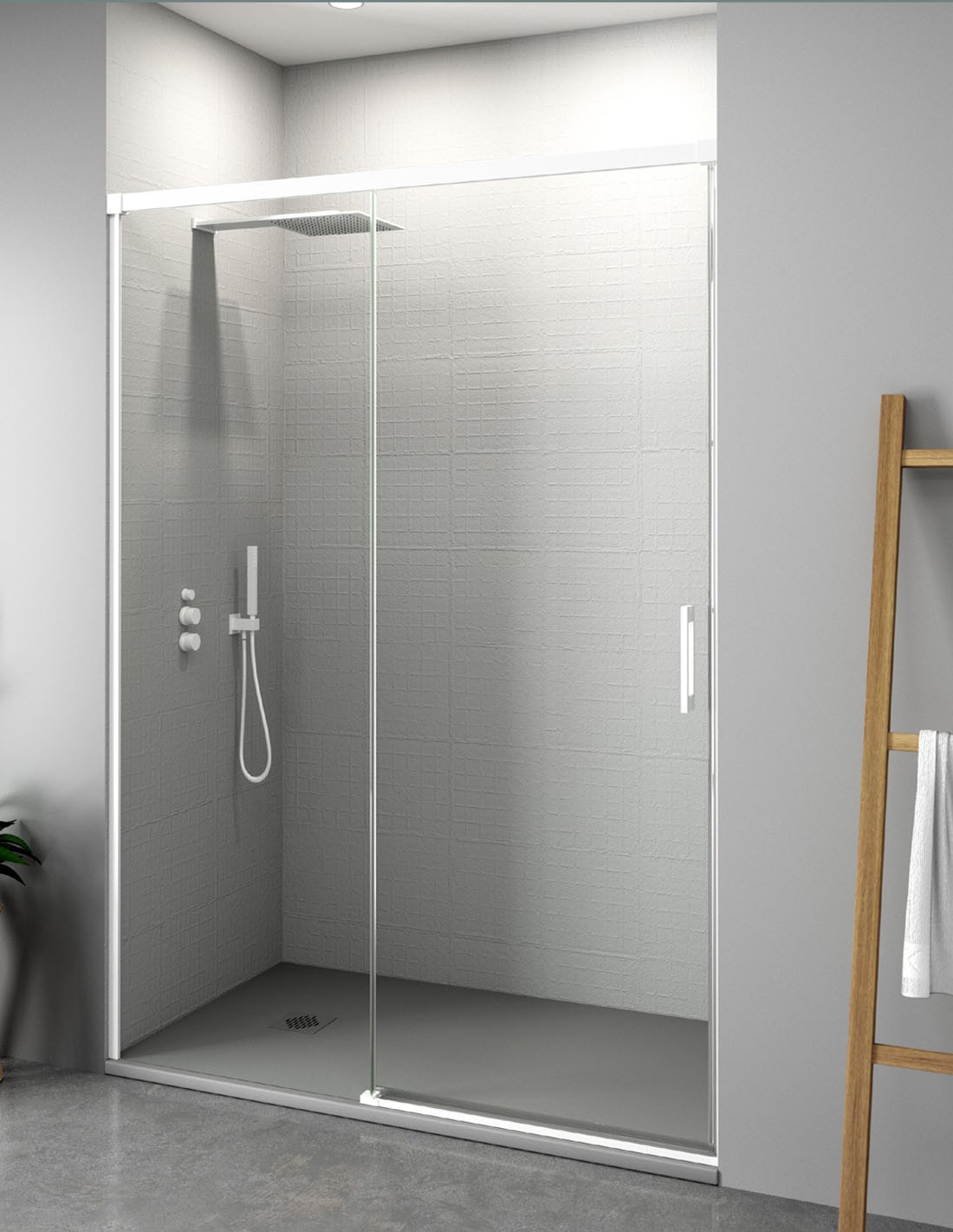 Mampara de aluminio Yaiza perfil blanco con 1 fijo y 1 puerta corredera con vidrio transparente o decorado ¡Conoce nuestra mampara!