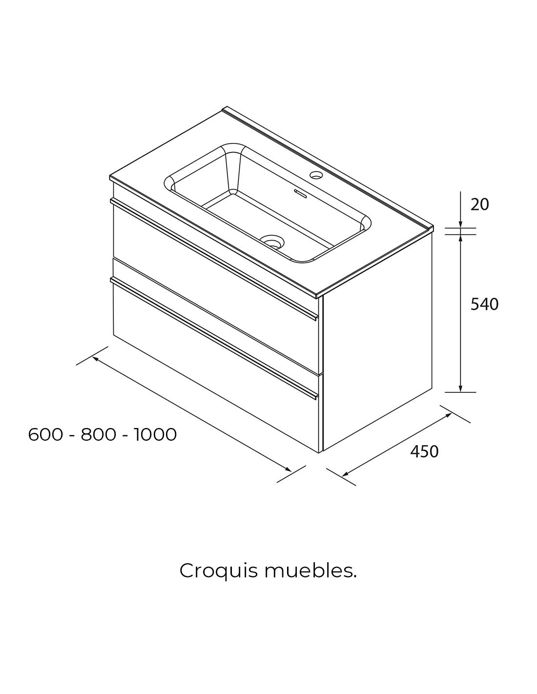 ANCHO: 60, 80 y 100 cm. (2 cajones y un lavabo). También disponible en medidas de 120 cm. (4 cajones y 2 senos en el lavabo).