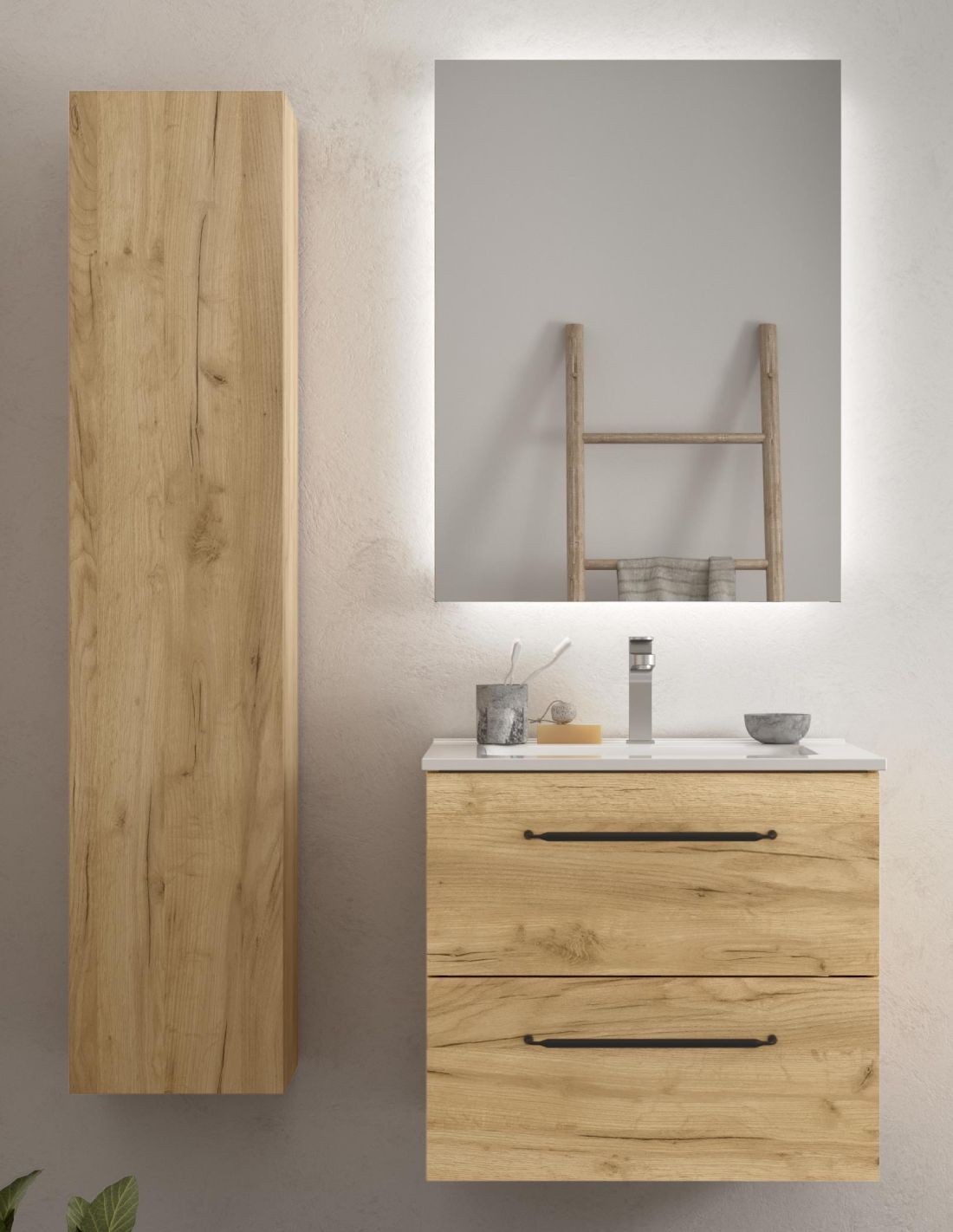 ¿Buscas un mueble de baño de tendencia, funcional y bonito? El modelo de mueble de baño con lavabo suspendido Morai es lo que buscas. 2 cajones con tiradores negros. ¡Conócelo!