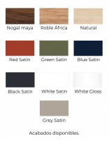 Disponible en acabados: Roble África, Nogal Maya, Natural, White Gloss, White Satin, Black Satin, Blue Satin, Red Satin y Grey Satin y Green Satin.