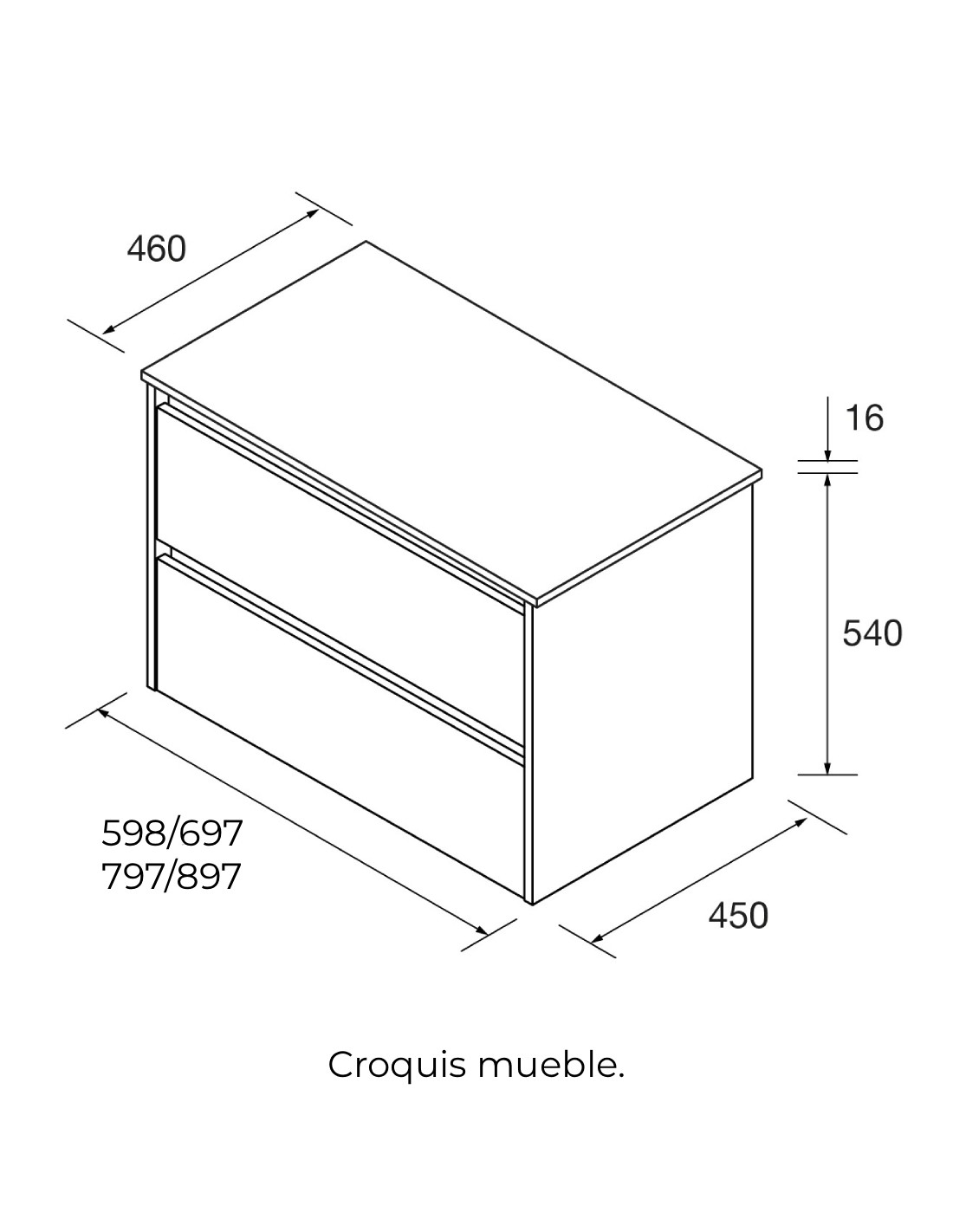 ANCHO: 60, 70, 80, 90 y 100 cm. (2 cajones y 1 lavabo sobre encimera). También disponible en 120 y 140 cms. (4 cajones y 1 ó 2 lavabos sobre encimera).