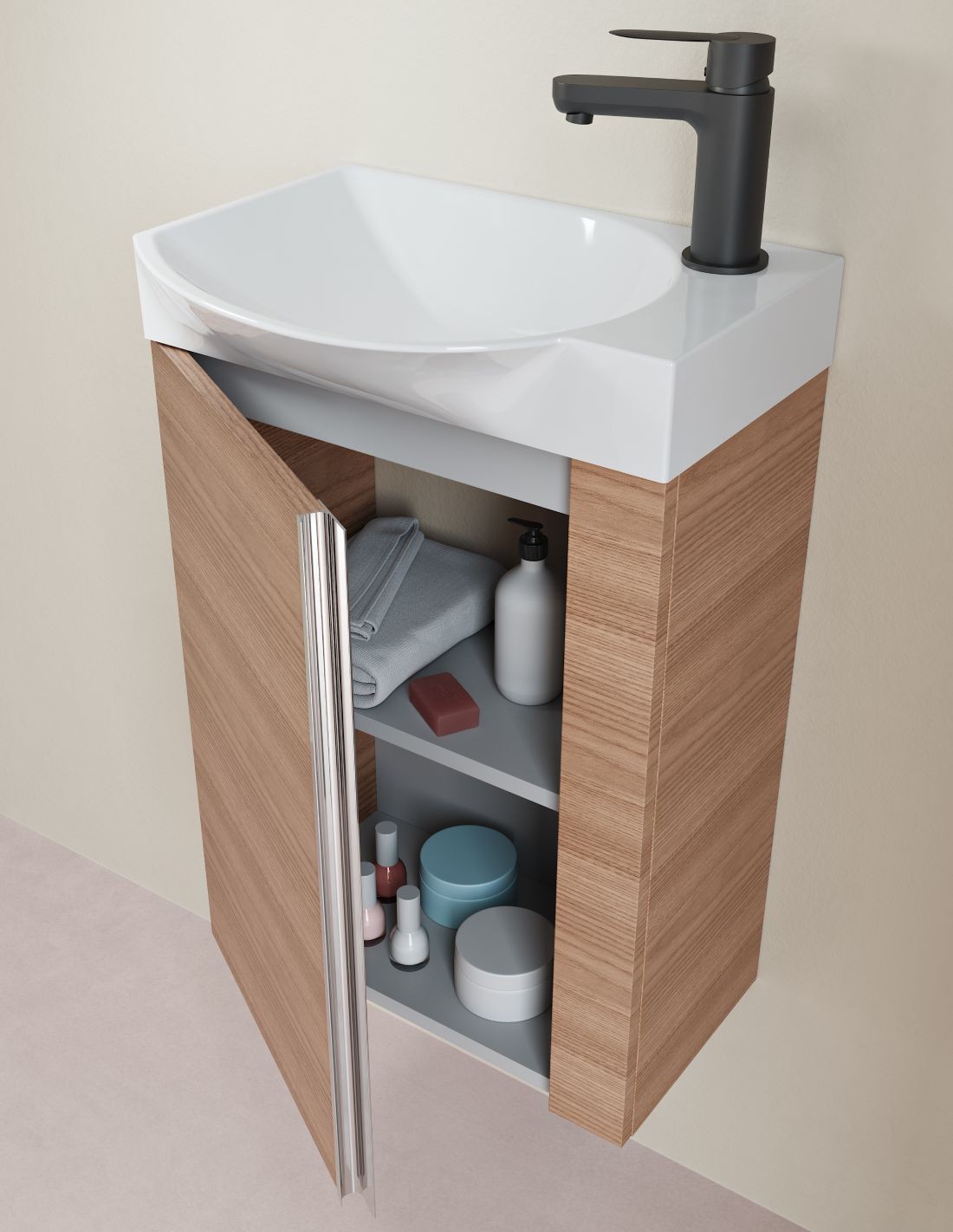 Mueble baño fondo reducido Royo modelo de 1 puerta Elegance. Lavabo cerámico incluido. Disponible en 5 acabados. ¡Conócelo!