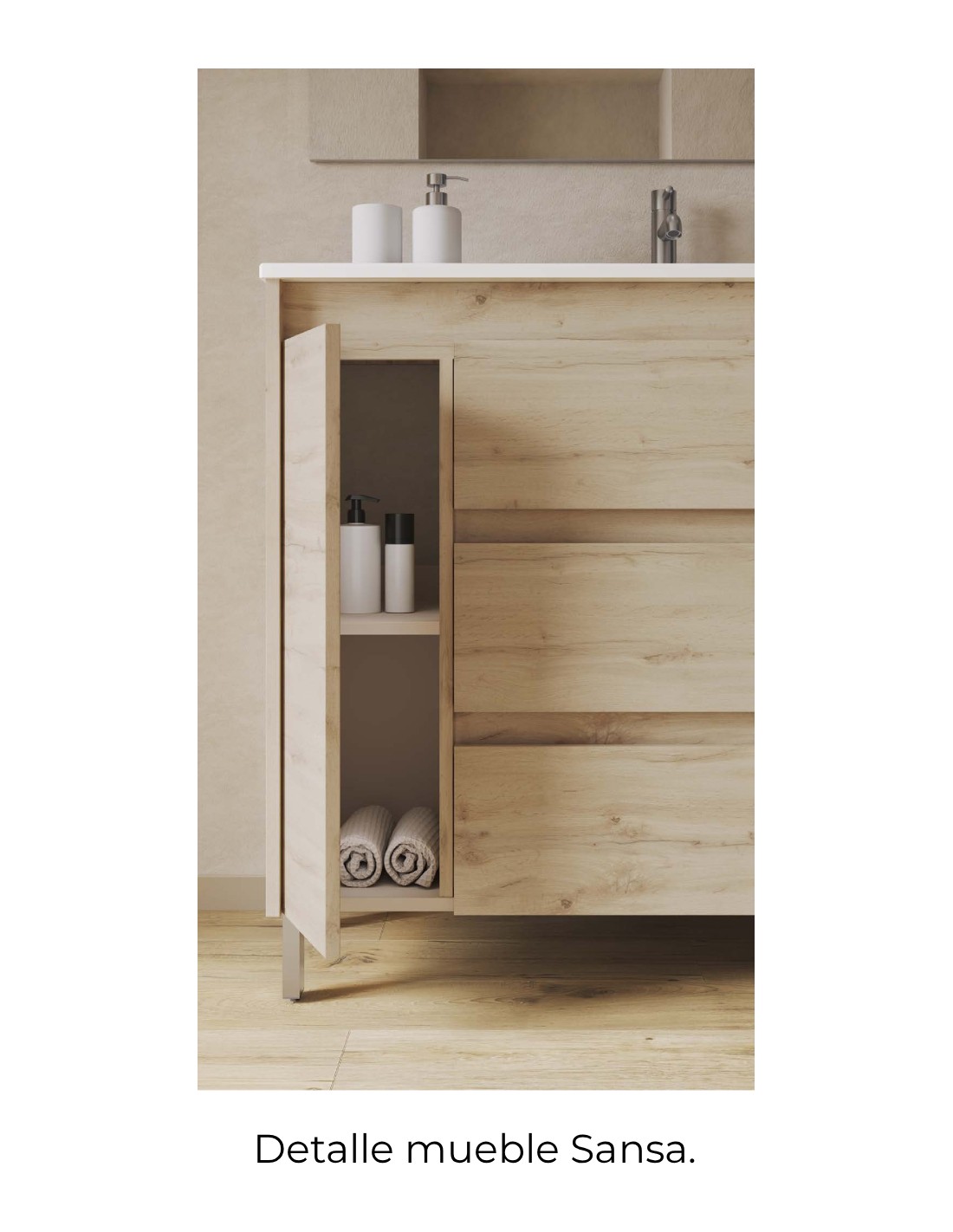 Mueble Royo Lavabo - desplazado de 3 cajones y 1 puerta modelo Sansa. Lavabo cerámico desplazado incluido. Disponible en 4 acabados. ¡Conócelo!
