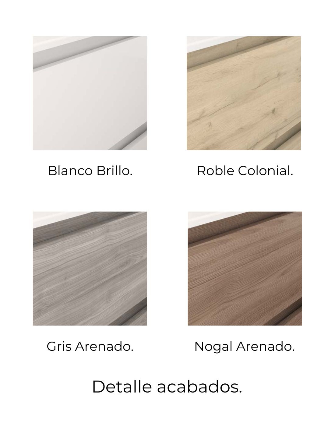 Disponible en acabados madera: Roble Colonial, Nogal Arenado y Gris Arenado.