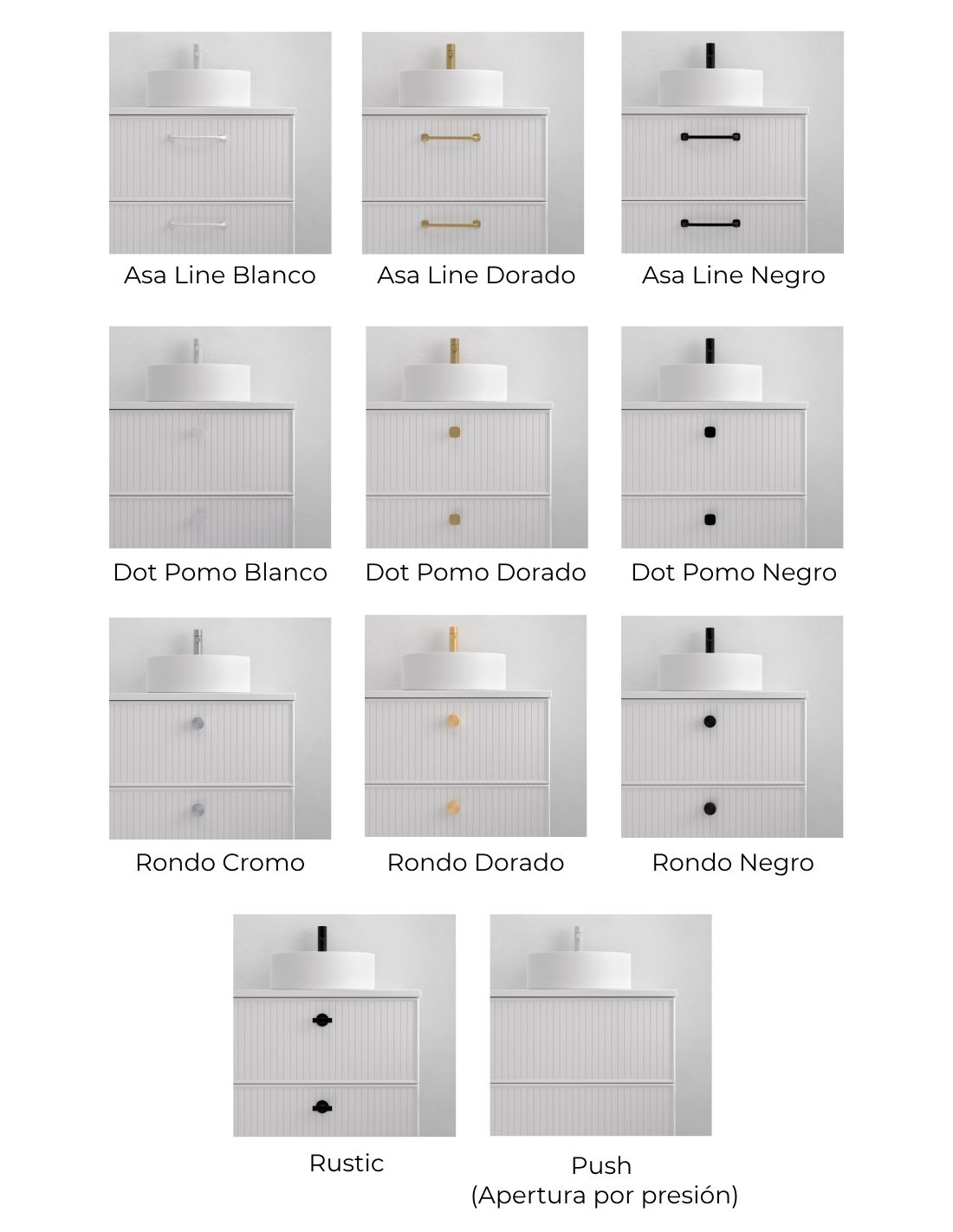 • Opción de elegir entre varios diseños y colores diferentes de tiradores (ver tabla).