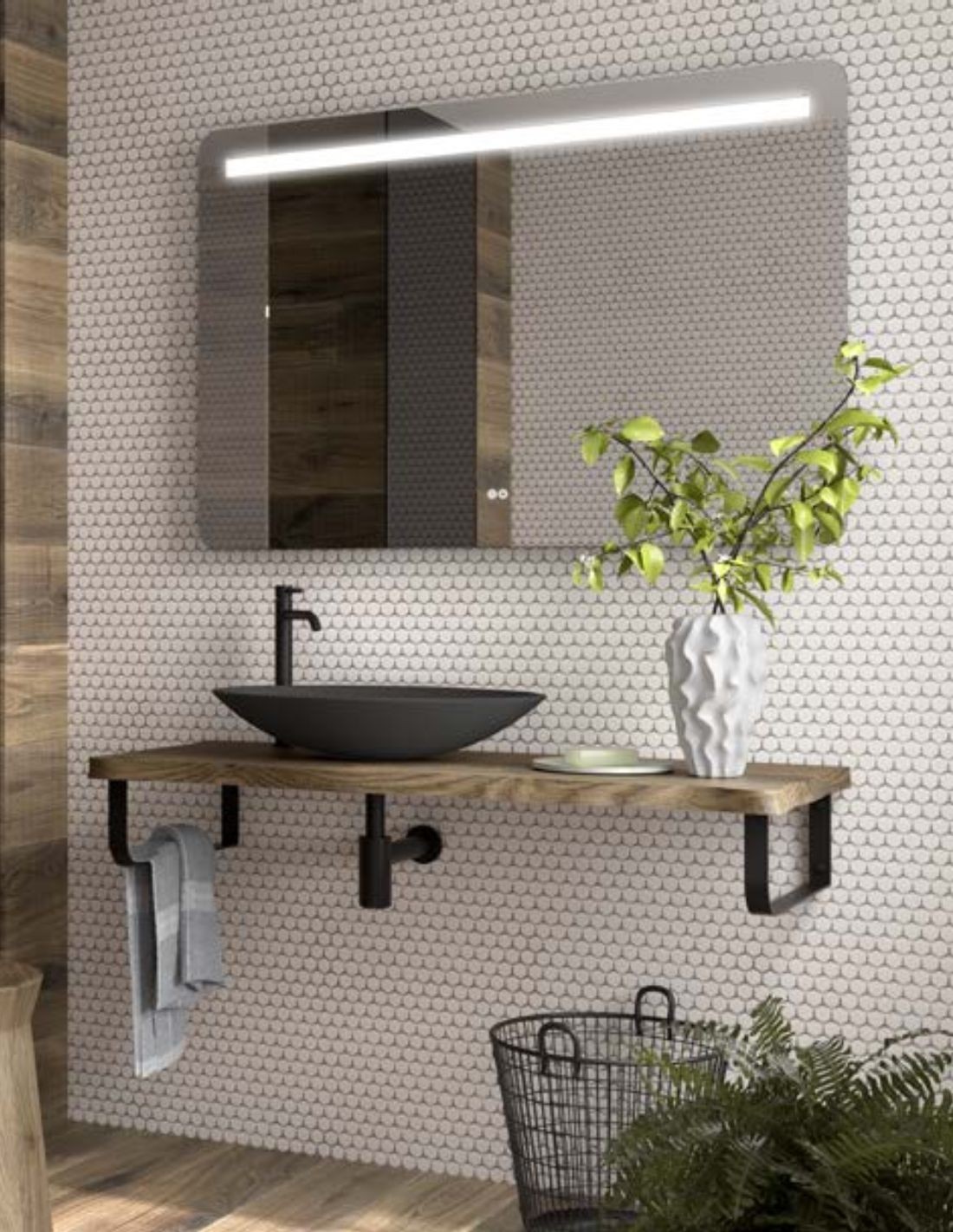 Son el soporte ideal para un lavabo sobre encimera, creando un contraste visual atractivo entre la rusticidad de la madera y la modernidad de la pieza cerámica o de resina. Este diseño aporta un carácter acogedor, orgánico y atemporal, transformando el baño en un refugio de estilo campestre.