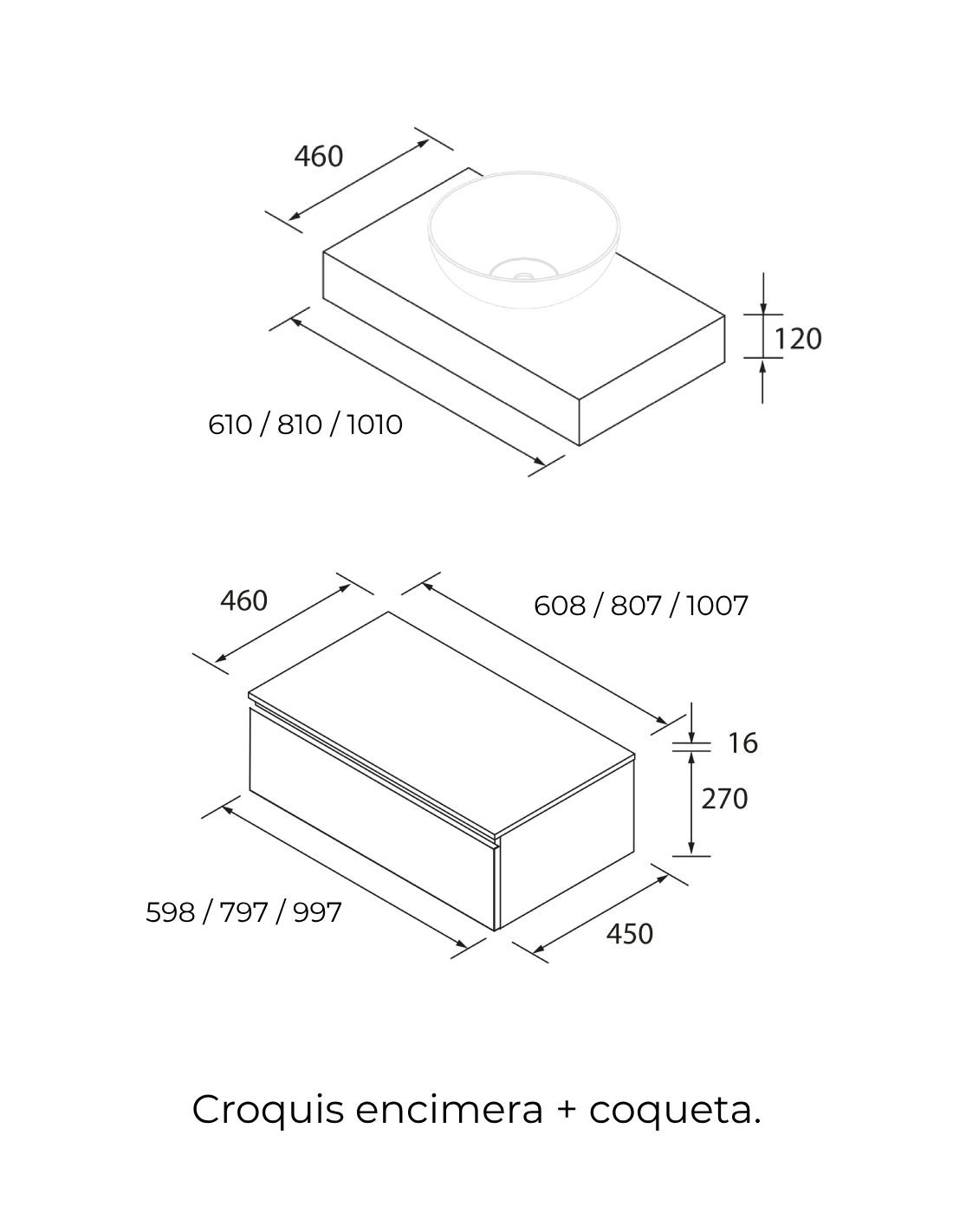 ANCHO: 60, 80 y 100 cm. (1 cajonera + 1 encimera del mismo acabado y un lavabo sobre encimera).