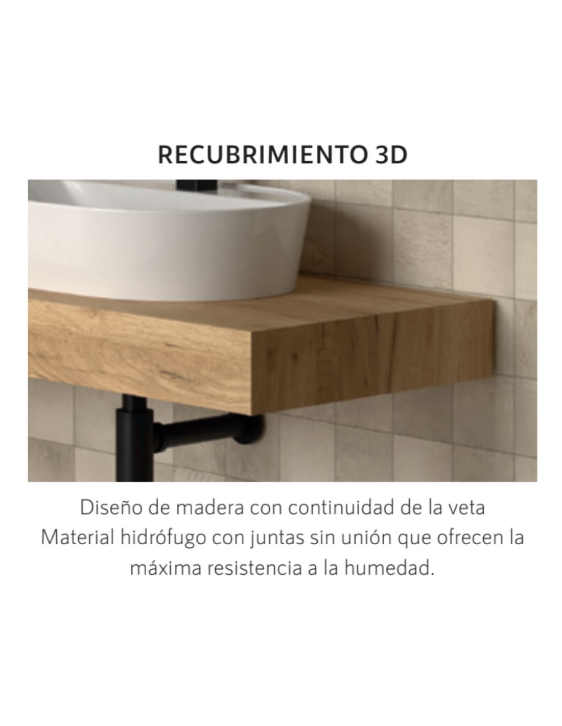 Gracias a la tecnologia de recibrimiento 3D, el diseño de la madera tiene continuidad de la veta por toda la encimera, además está fabricada en material hidrófugo con juntas sin unión que ofrecen la máxima resistencia a la humedad.