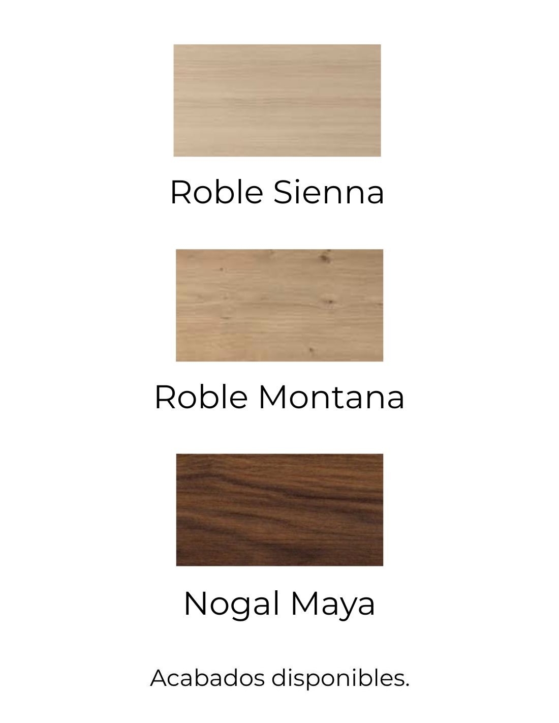 Disponible en 3 acabados madera: Roble Sienna, Roble Montana y Nogal Maya.
