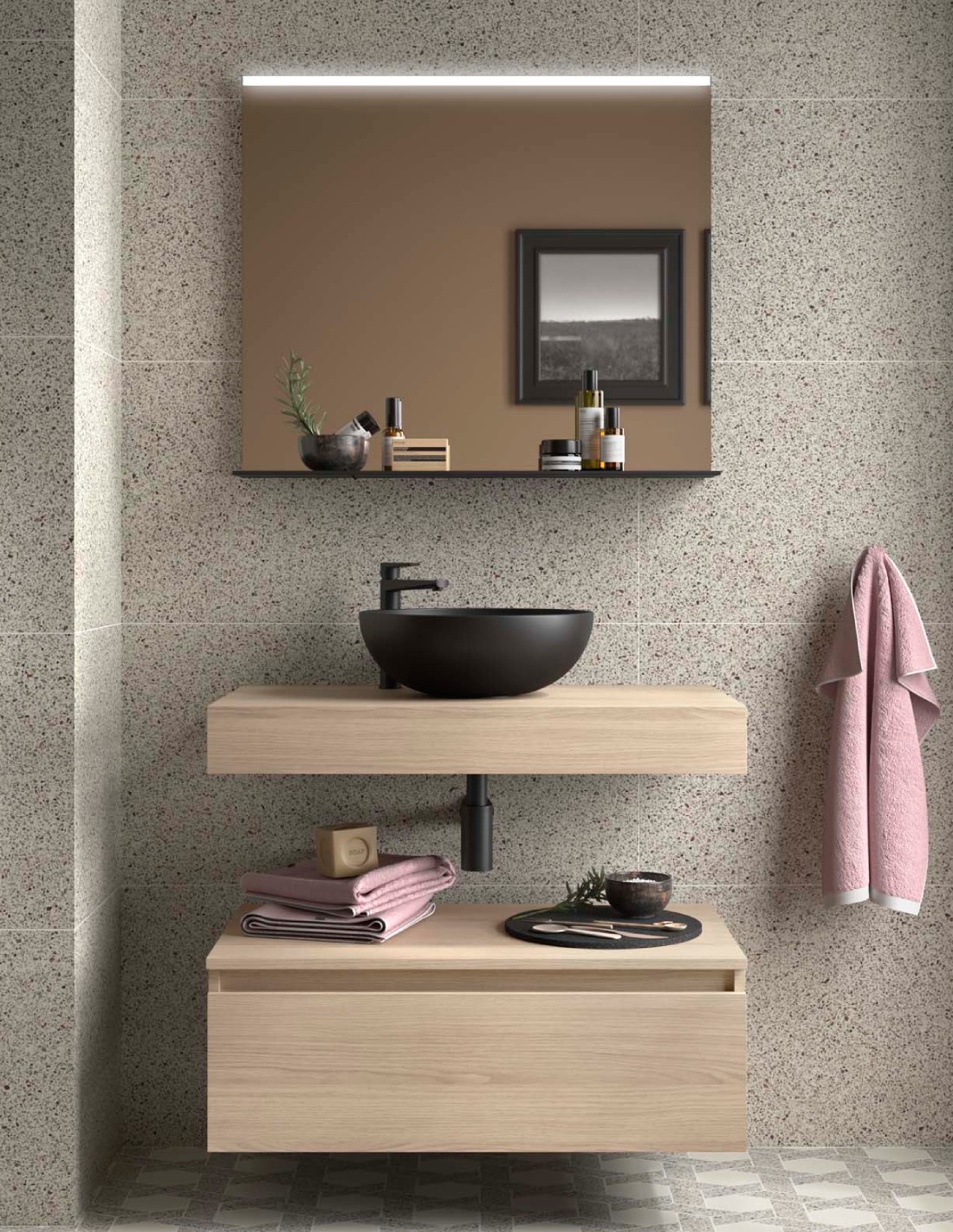 • Incluido LAVABO CERÁMICO NEGRO MATE SOBRE ENCIMERA de diseño exclusivo.
