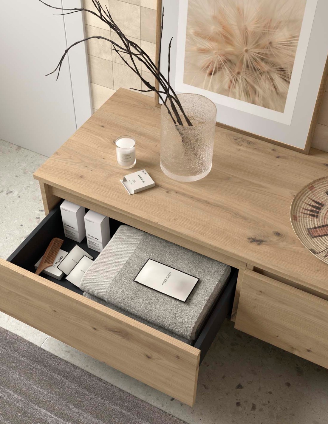 Conjunto encimera + cajonera Domus de Salgar. El estilo de lo esencial. Cuando todo sobra, aparece la verdadera belleza. Un espacio sereno, ligero y funcional donde cada línea respira diseño. DOMUS transforma el baño en un refugio de calma y sofisticación: un lugar donde menos es mucho más.