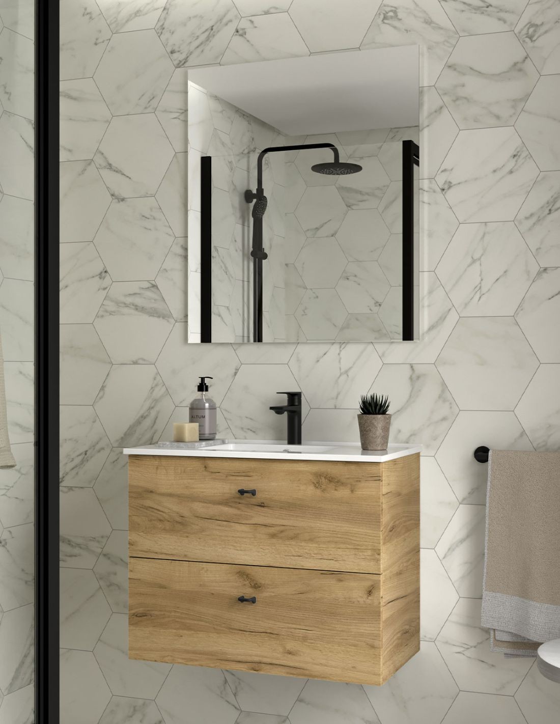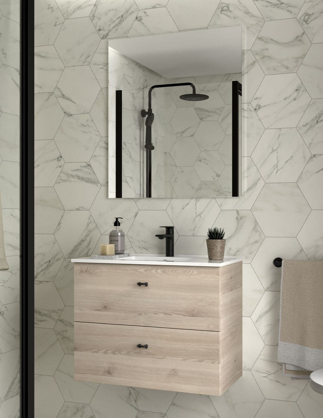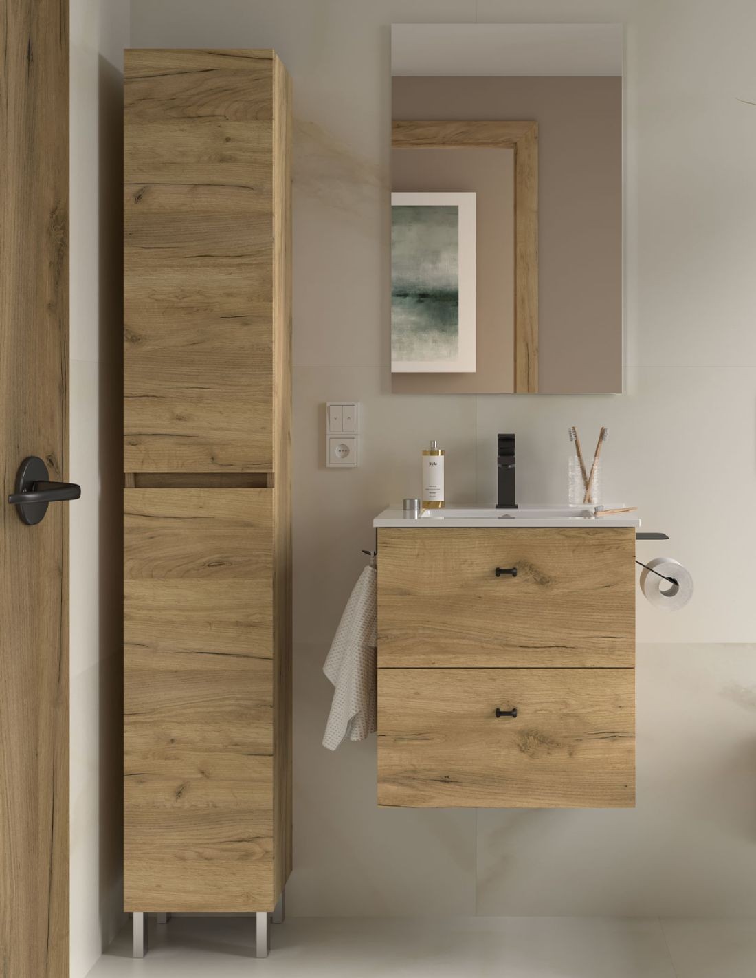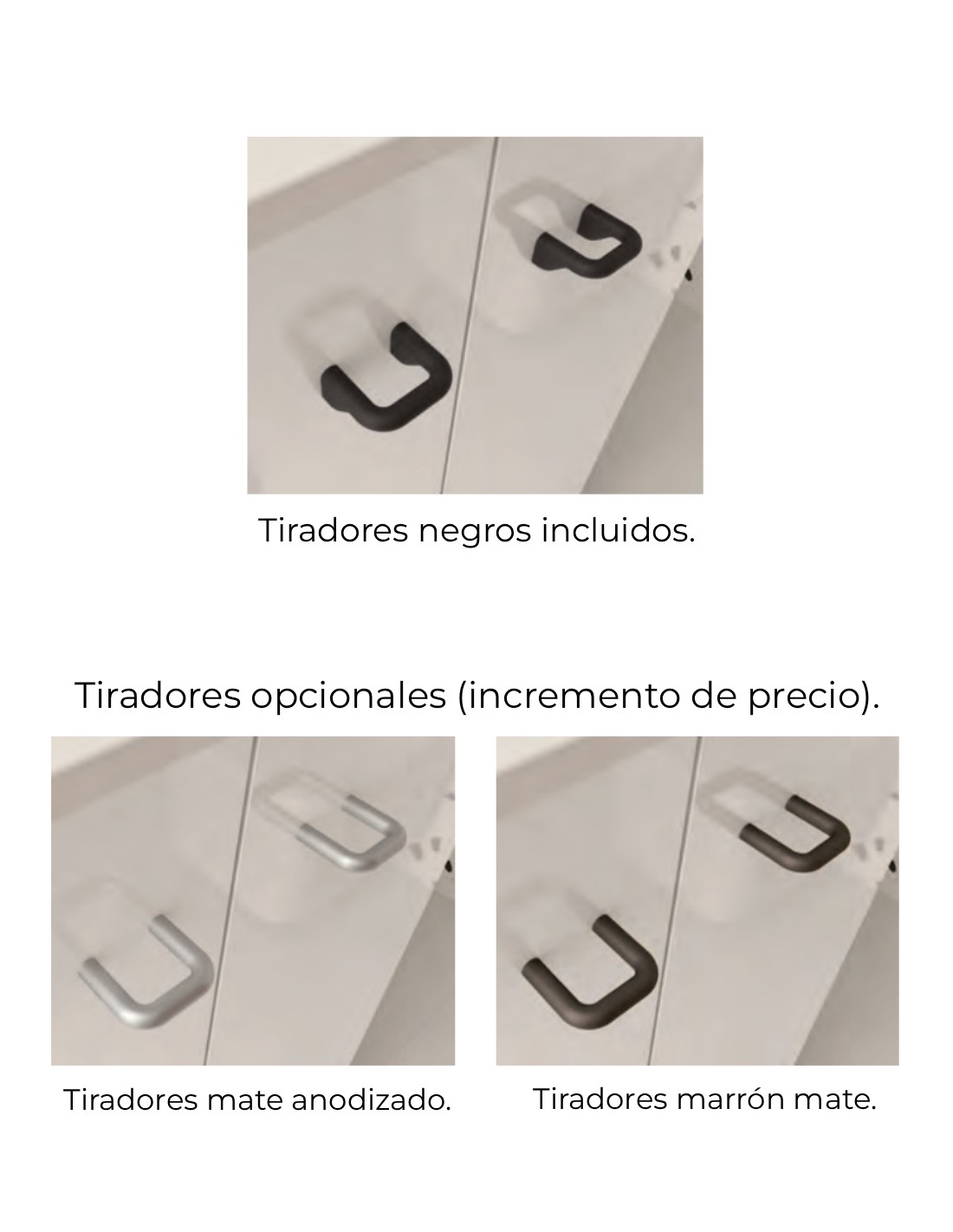 - Personaliza tu mueble con el tirador que mejor combine en tu baño: negro mate, mate anodizado o marrón mate.