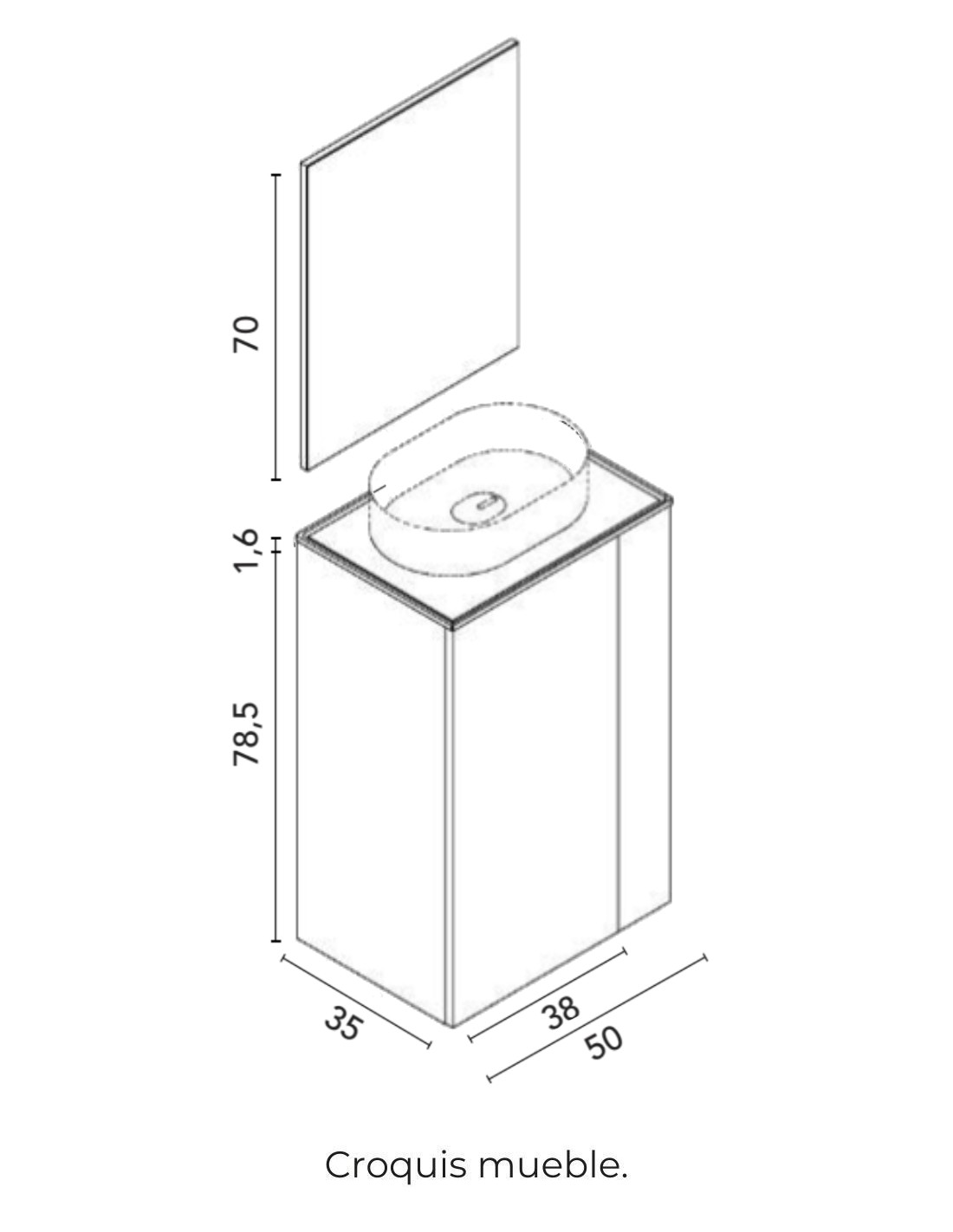 - Espejo (opcional): Espejo RECTANGULAR modelo Murano sin luz de 50 cm. ancho x 70 cm. de alto.