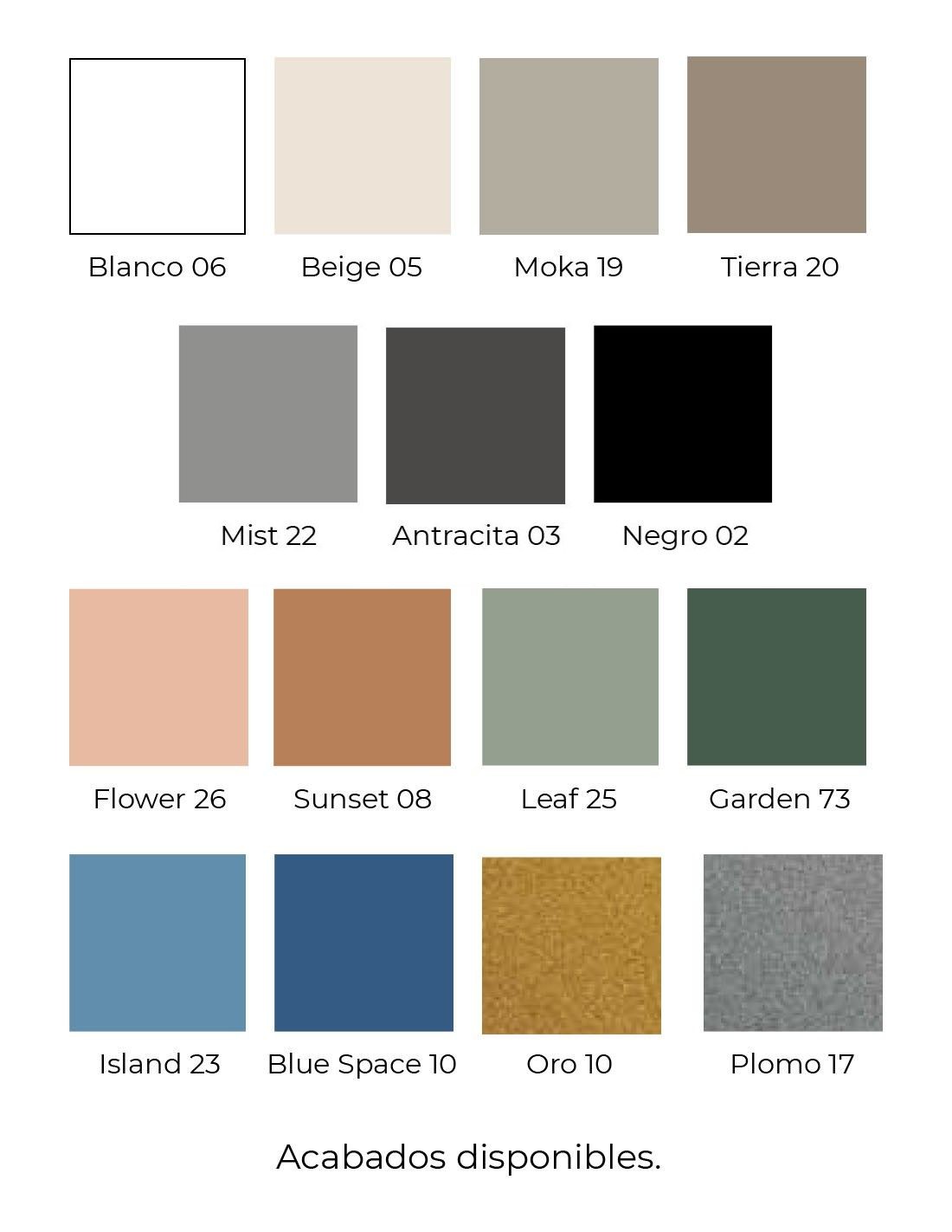 FRENTE CAJÓN: Blanco 06, Negro 02, Antracita 03, Beig 05, Moka 19, Tierra 20, Mist 22, Flower 26, Sunset 08, Leaf 25, Garden 73, Island 23, Blue Space 10. Metalizados: Oro 10 y Plomo 17 (ver tabla).