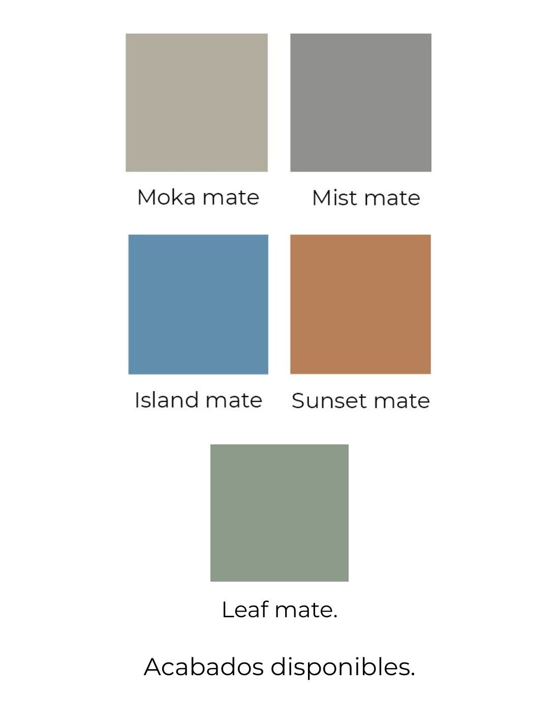 COLORES: MIST MATE, MOKA MATE, LEAF MATE, ISLAND MATE y SUNSET MATE.