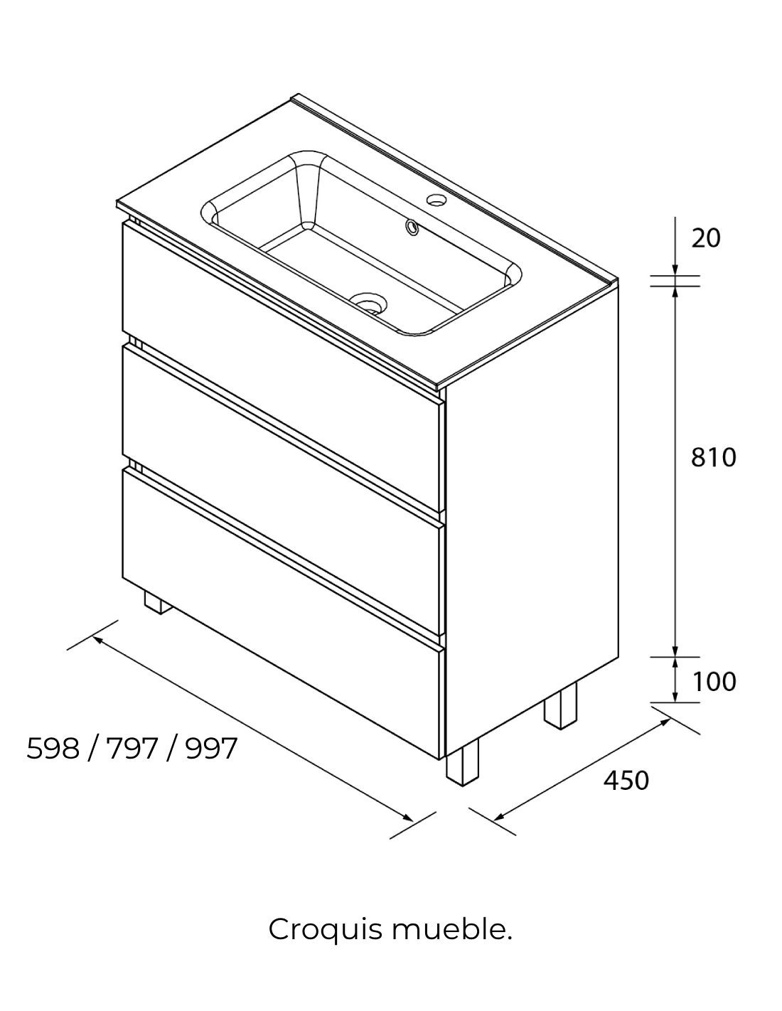 ANCHO: 60, 80 y 100 cm. (3 cajones y un lavabo). También disponible en medidas de 120 y 160 cm. (6 cajones y 2 senos en el lavabo).