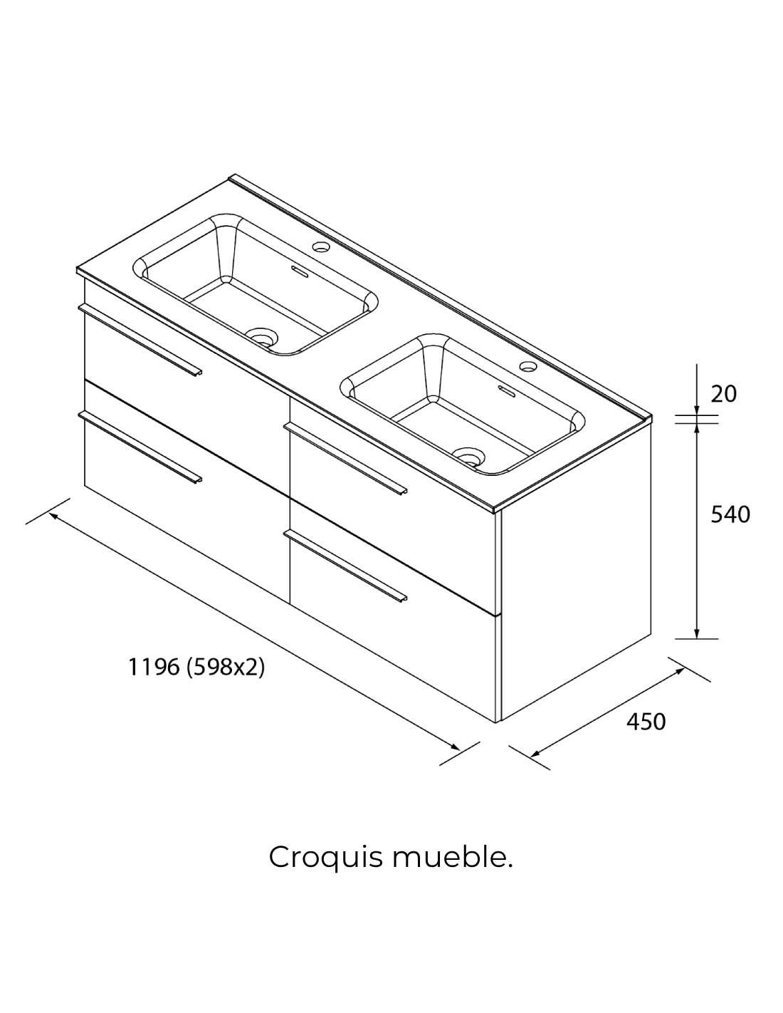 ANCHO: 120 cm. (4 cajones y 2 senos en el lavabo). También disponible en 60, 80, 100 y 120 cm.